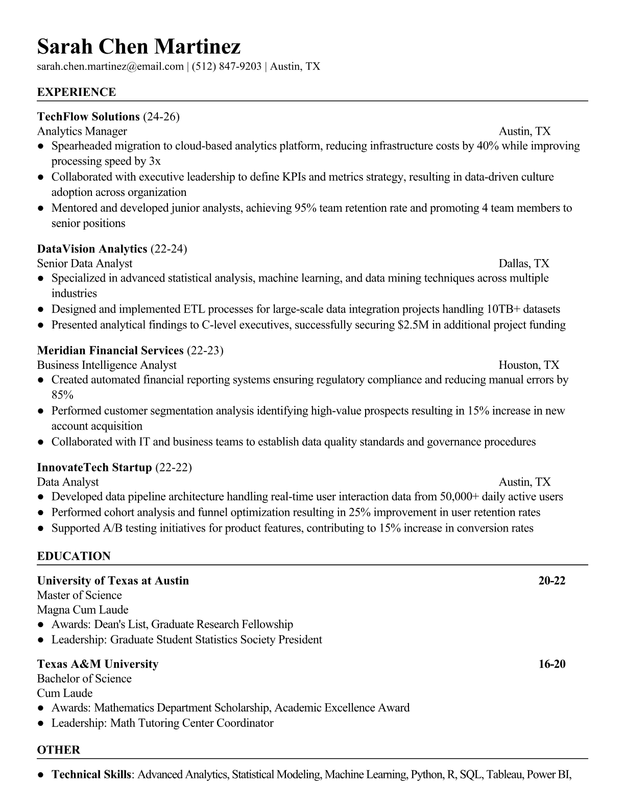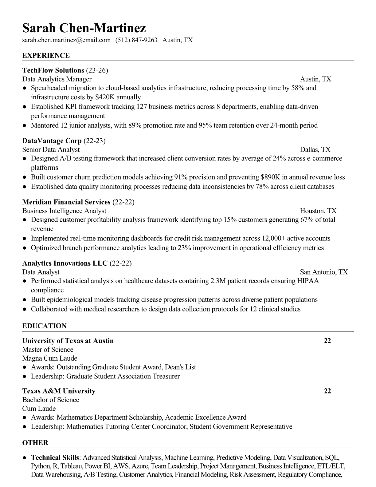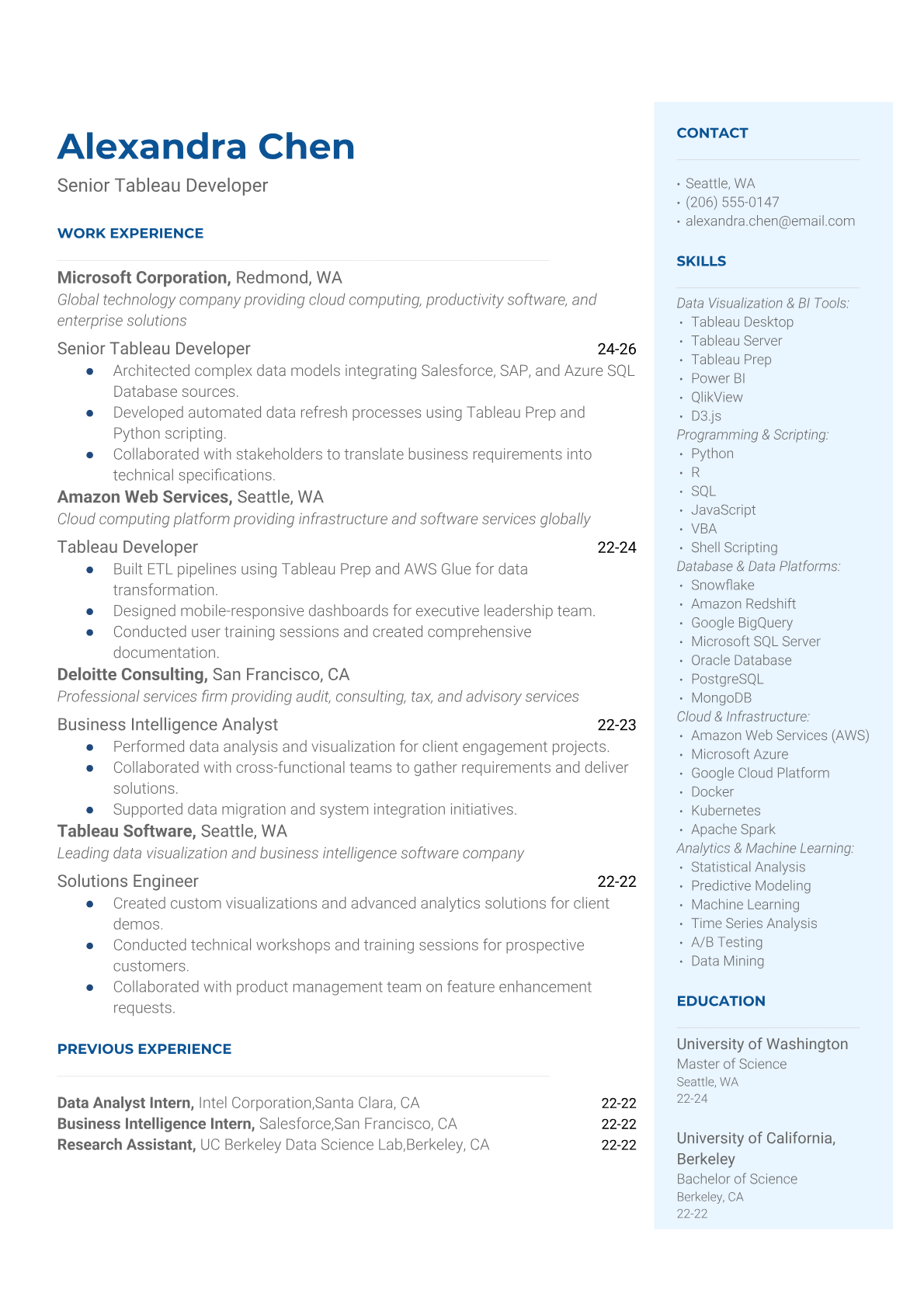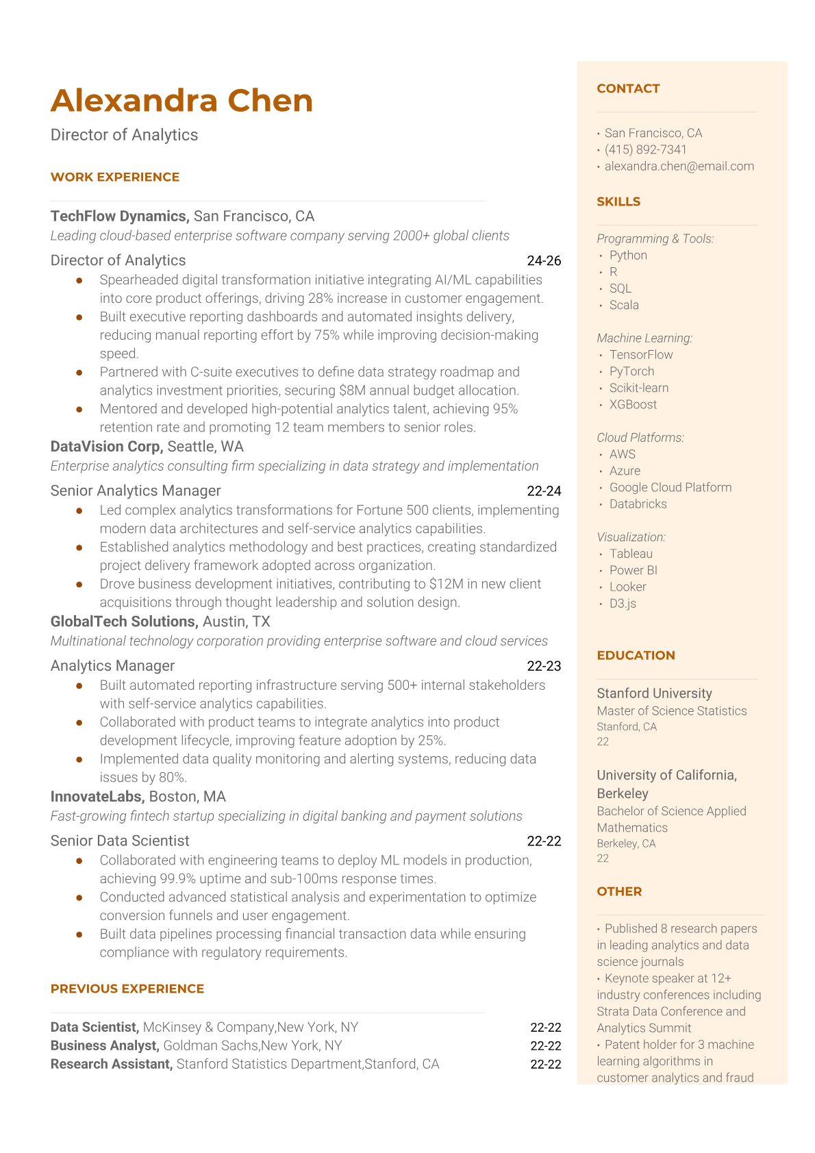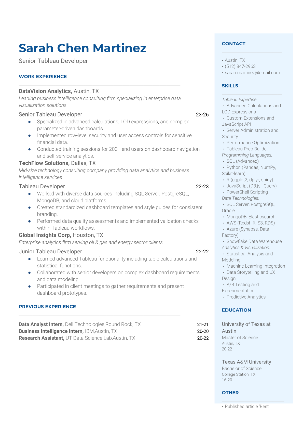 Browse data and analytics resume examples and ATS-optimized templates for data analysts, data engineers, BI specialists and more. Highlight SQL, Python, dashboards and business impact to stand out with recruiters.
