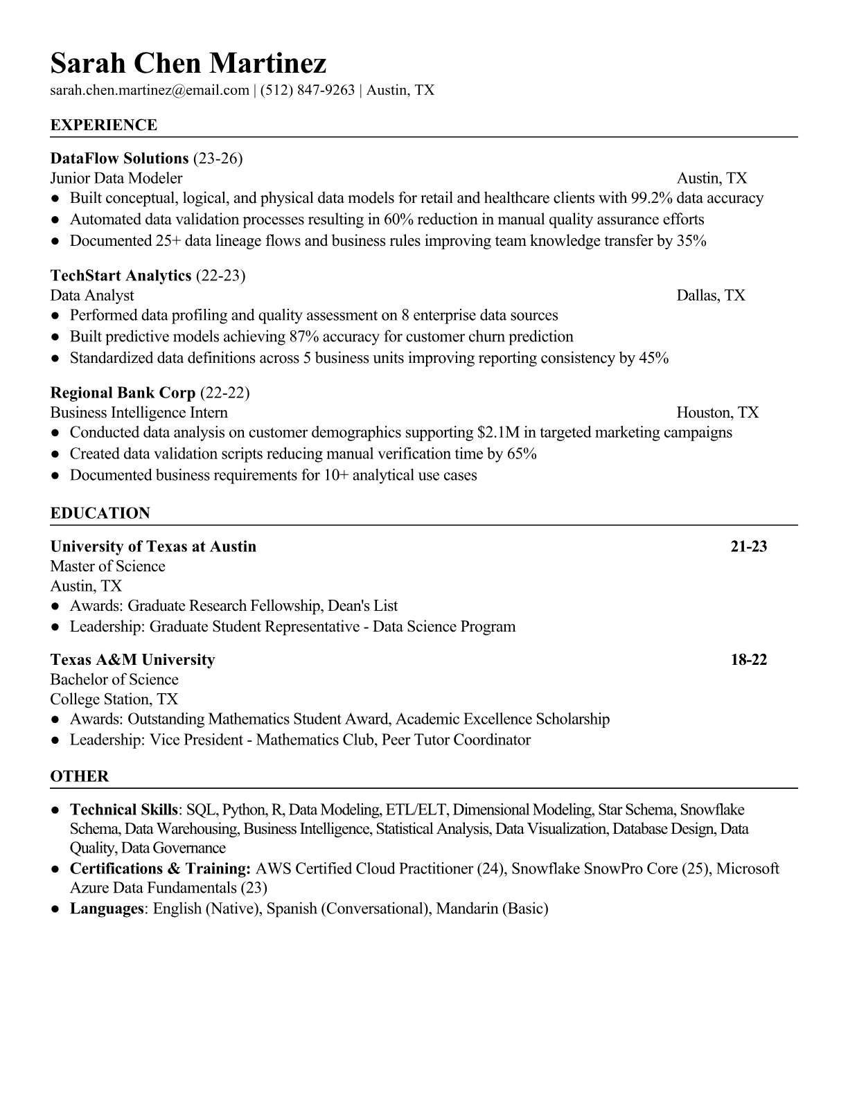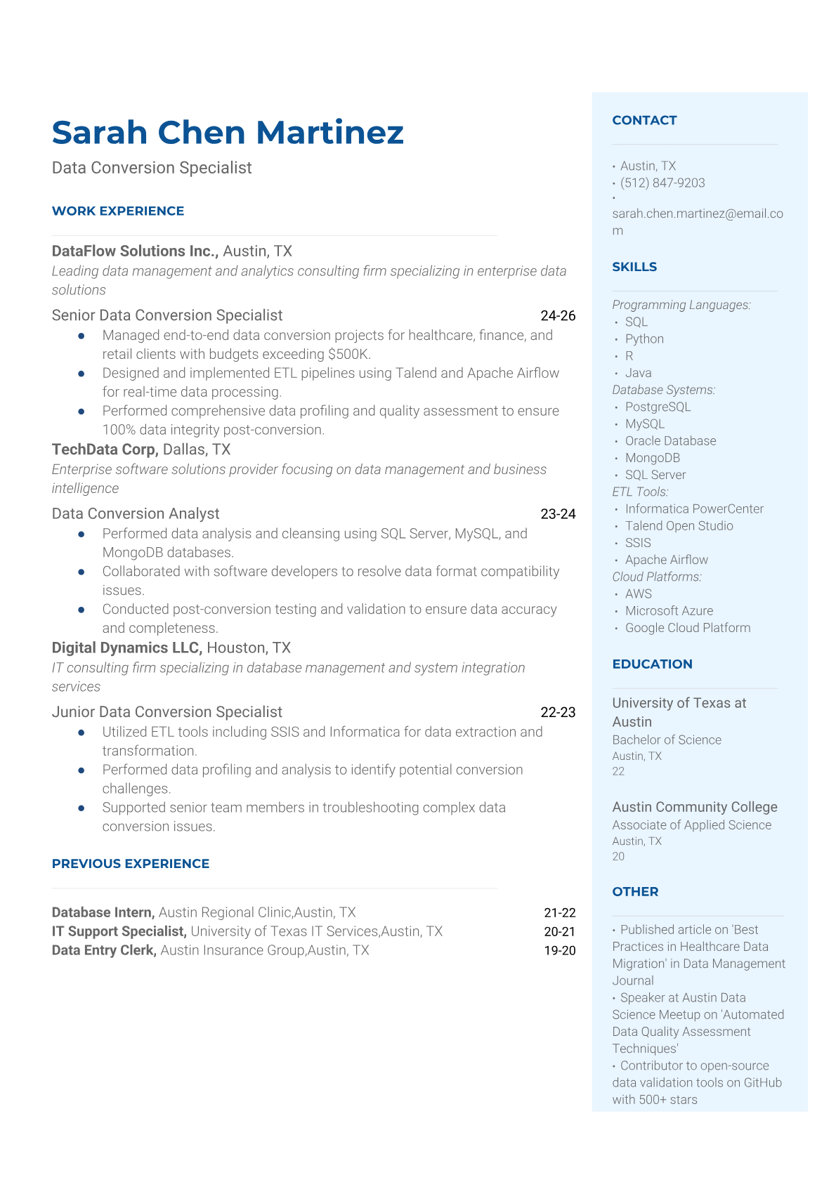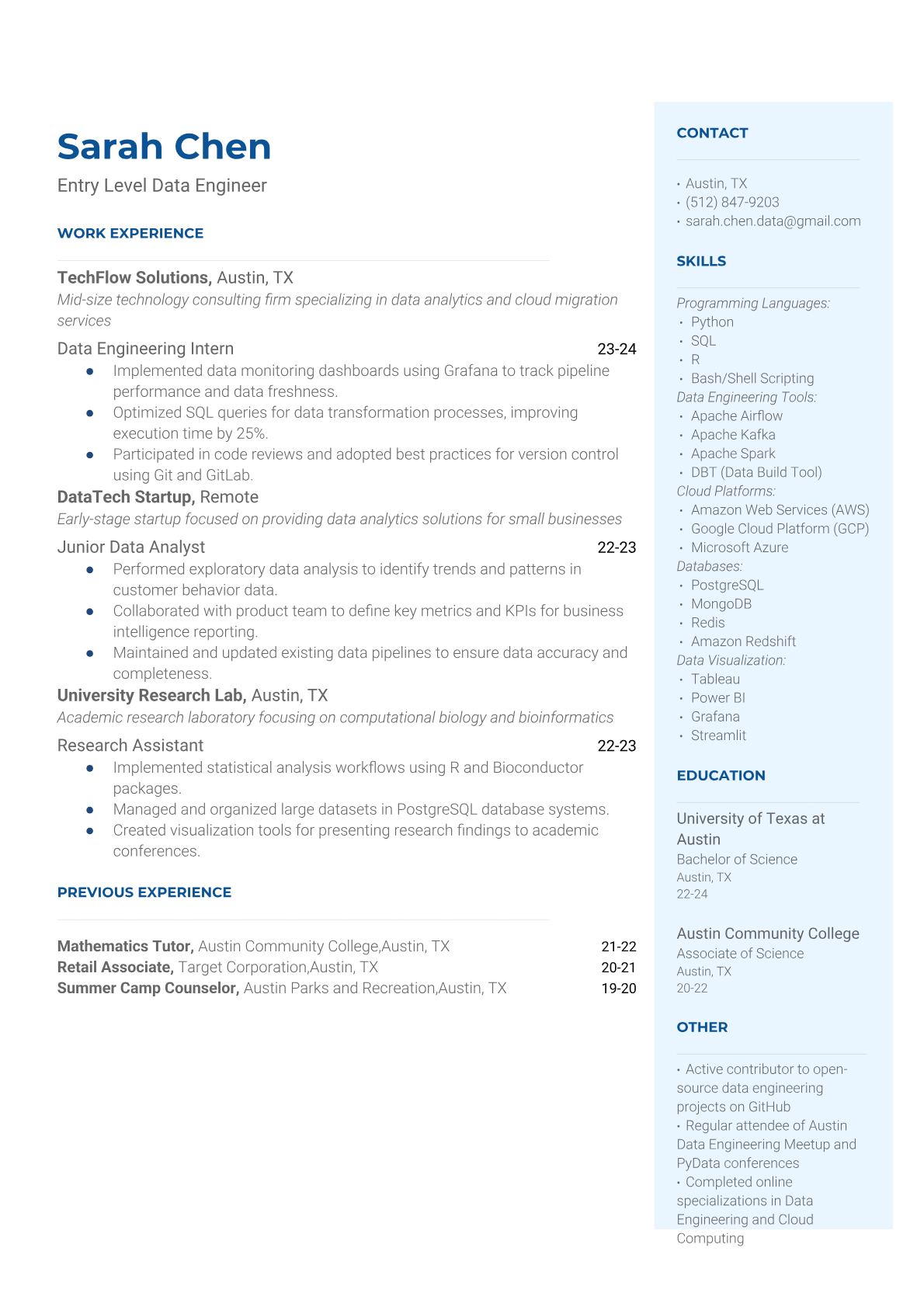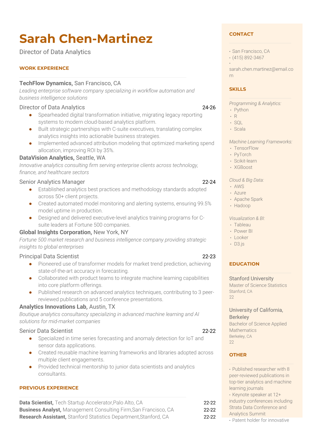 Browse data and analytics resume examples and ATS-optimized templates for data analysts, data engineers, BI specialists and more. Highlight SQL, Python, dashboards and business impact to stand out with recruiters.