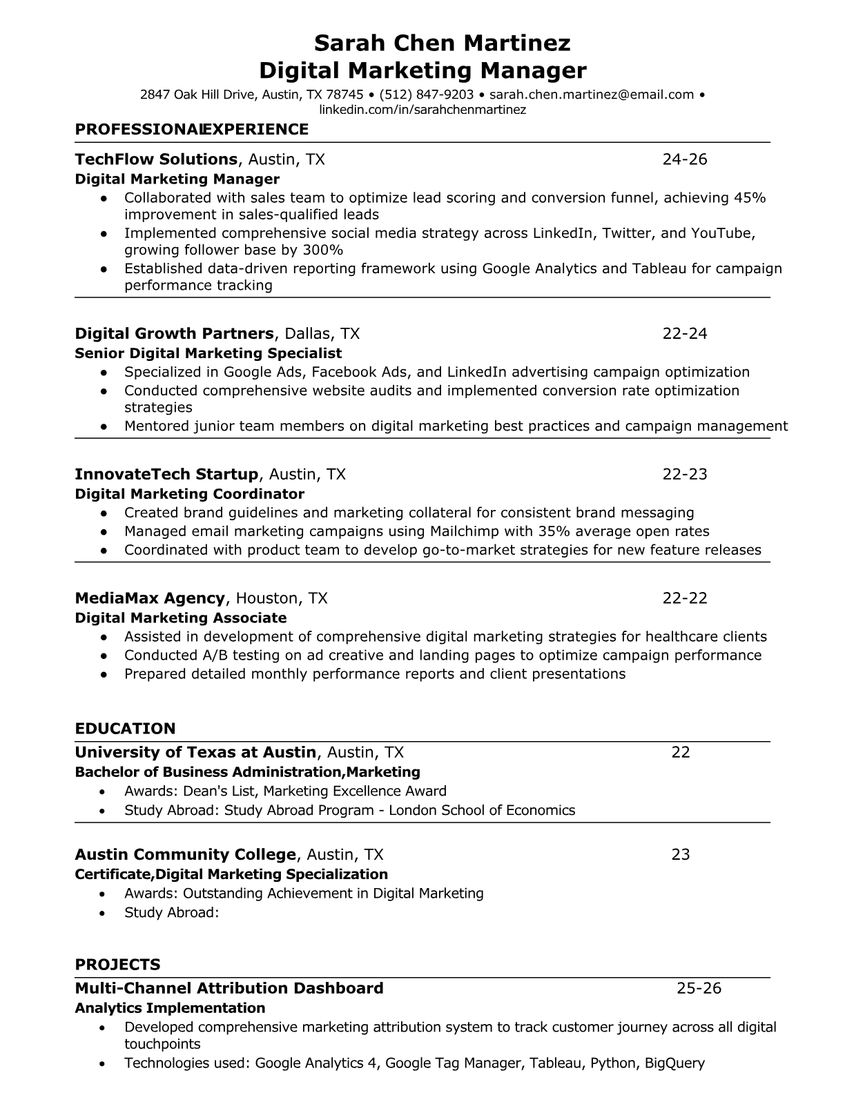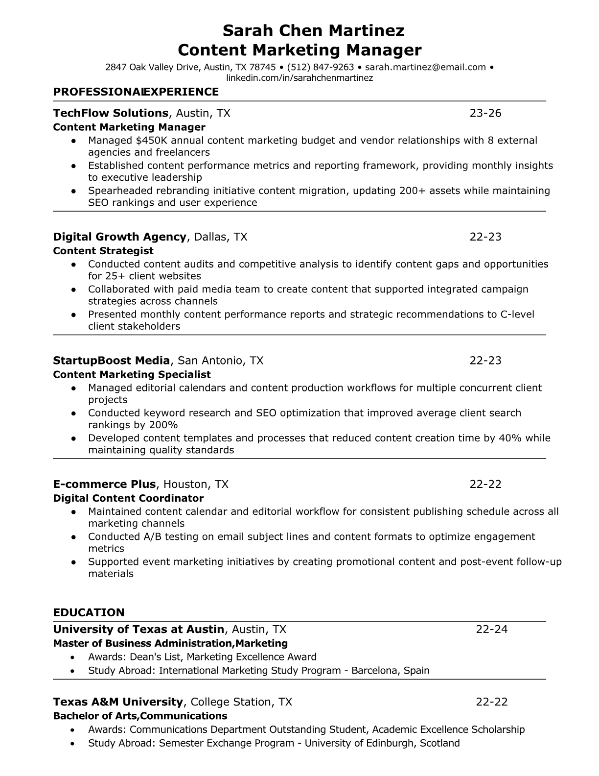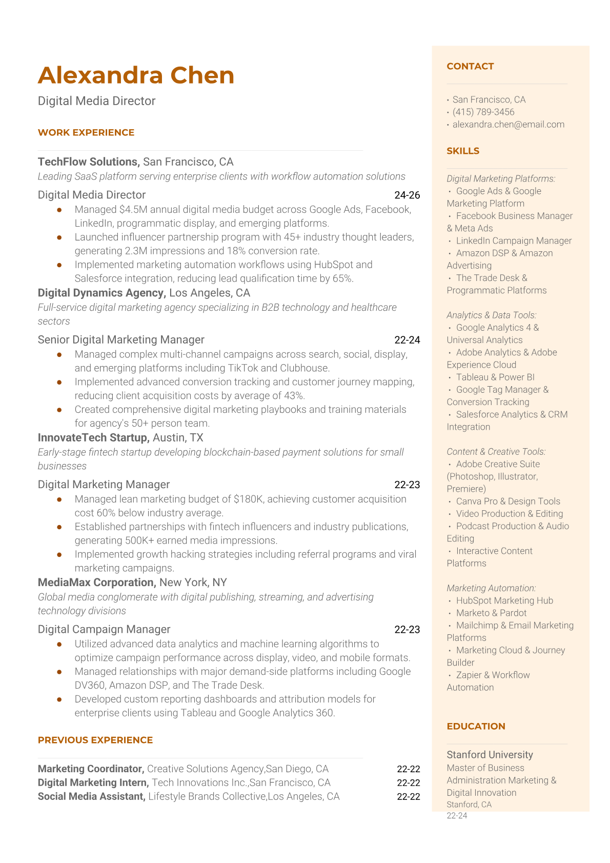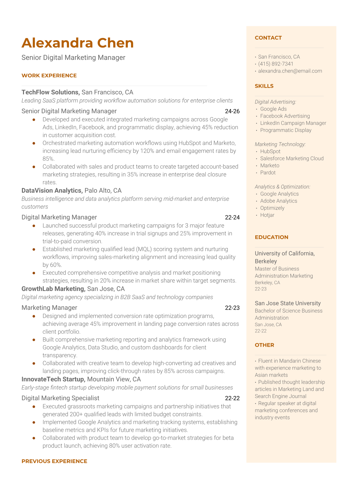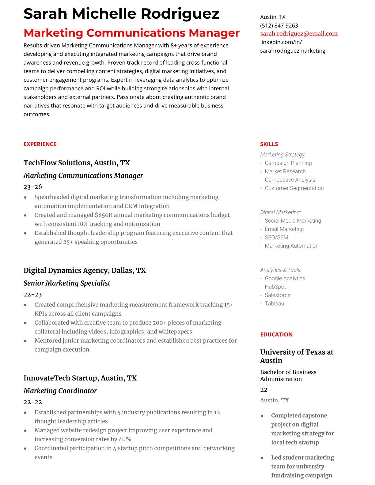 Browse marketing resume examples and modern templates for digital, content, growth and brand marketers. Emphasize campaign results, acquisition metrics and cross-channel strategy in an ATS-friendly format.