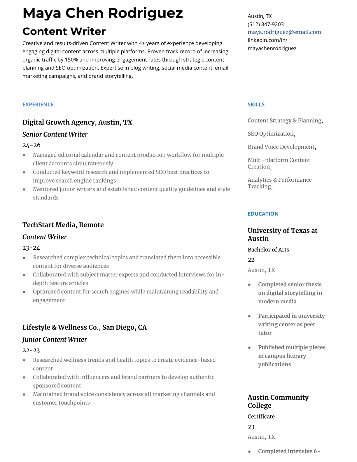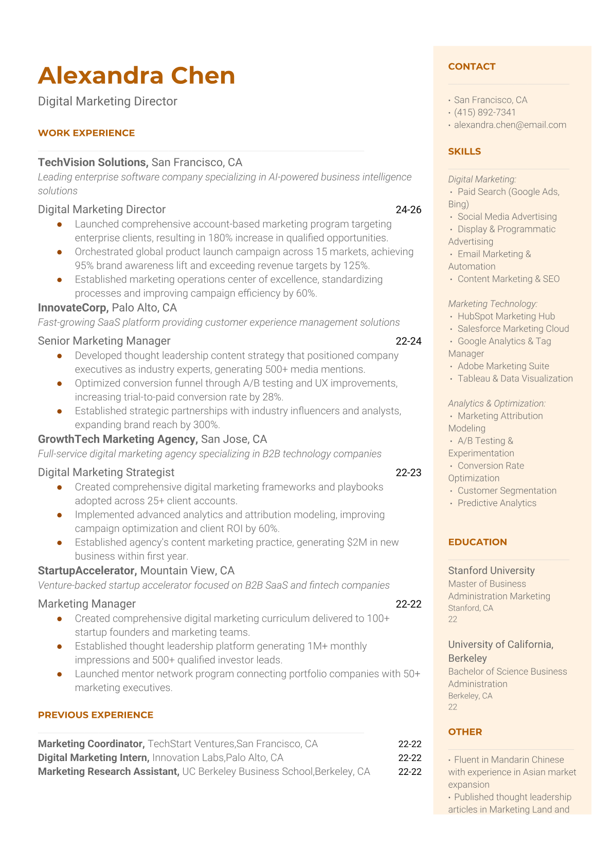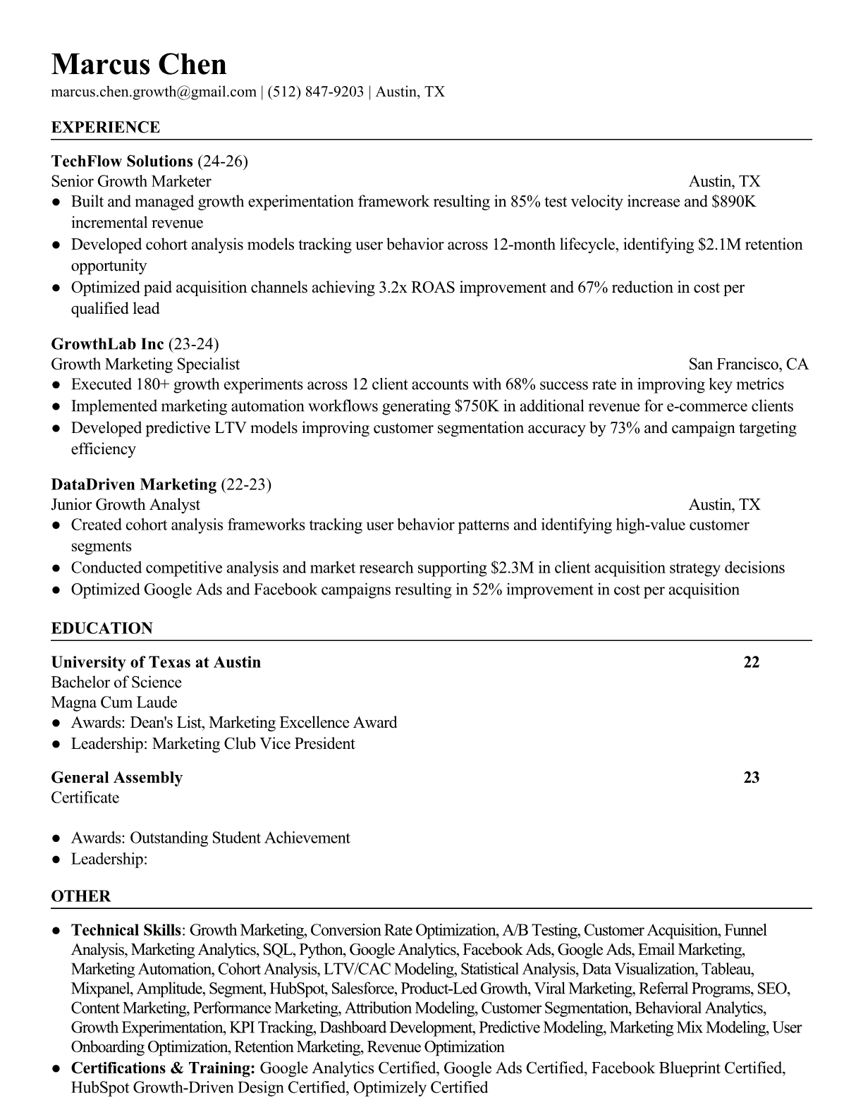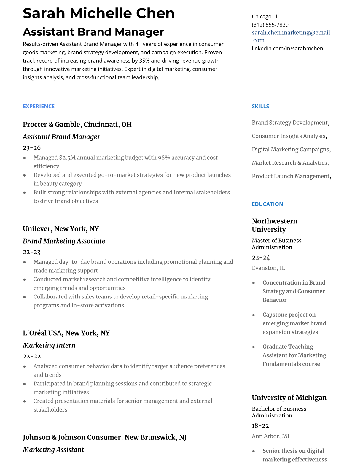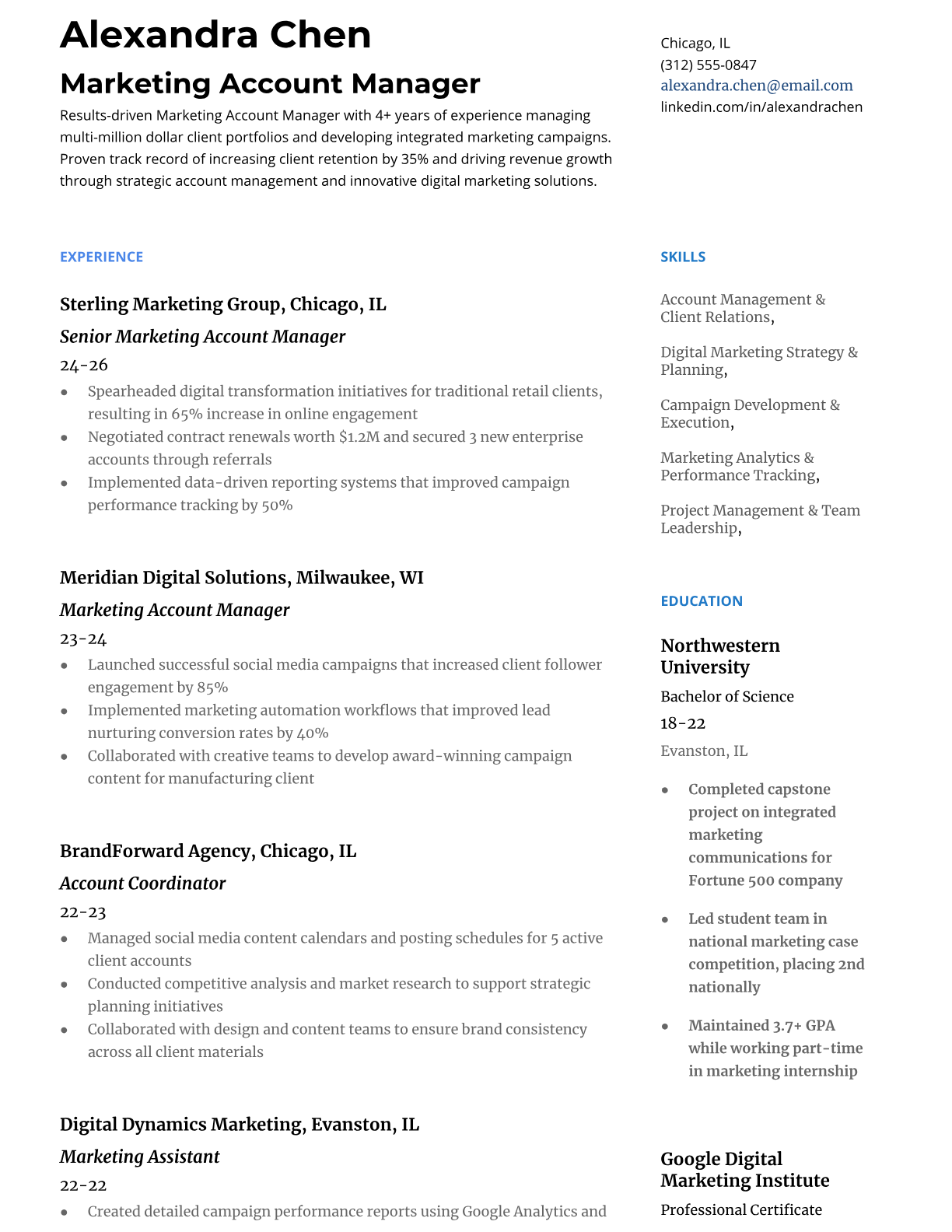 Browse marketing resume examples and modern templates for digital, content, growth and brand marketers. Emphasize campaign results, acquisition metrics and cross-channel strategy in an ATS-friendly format.