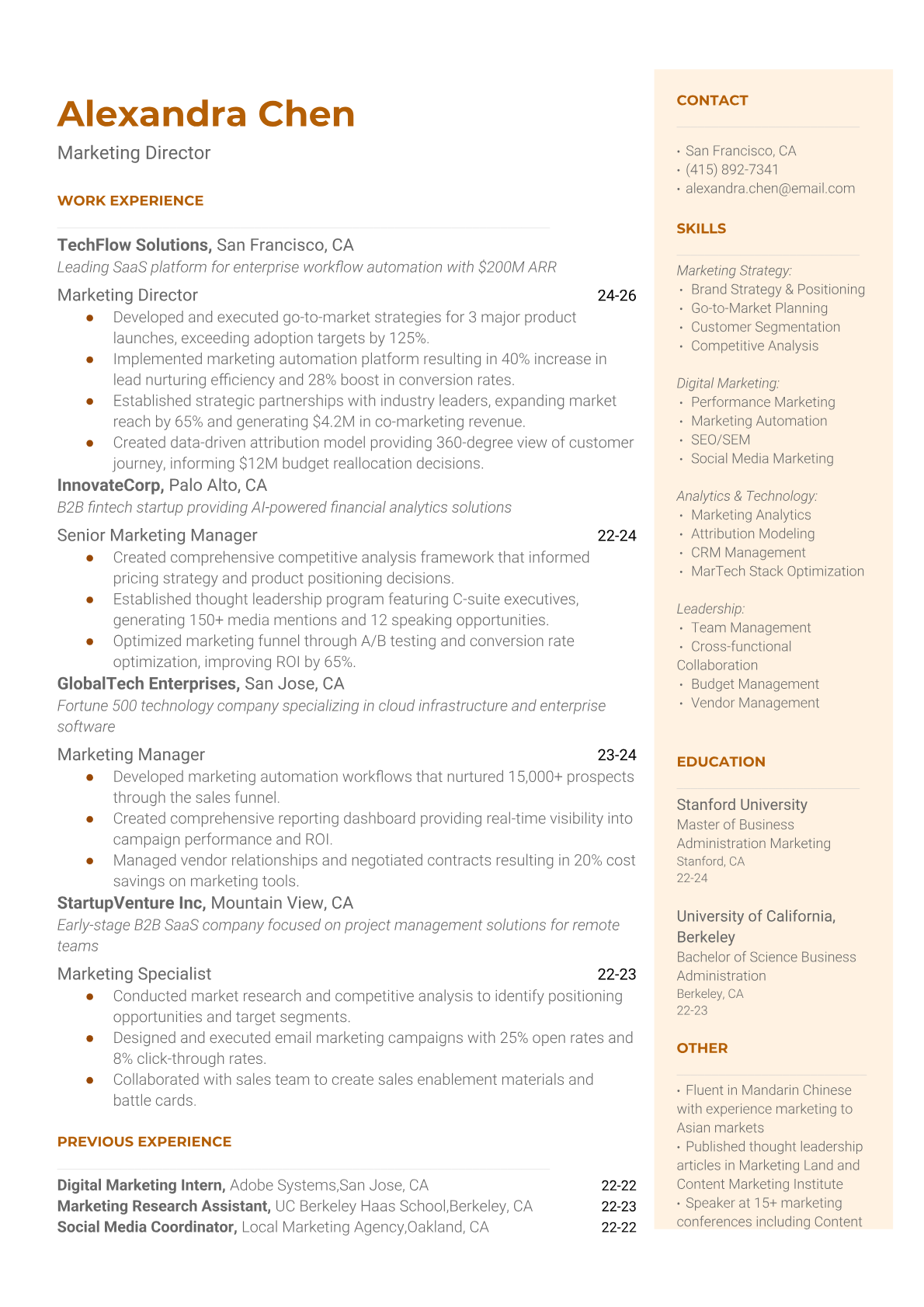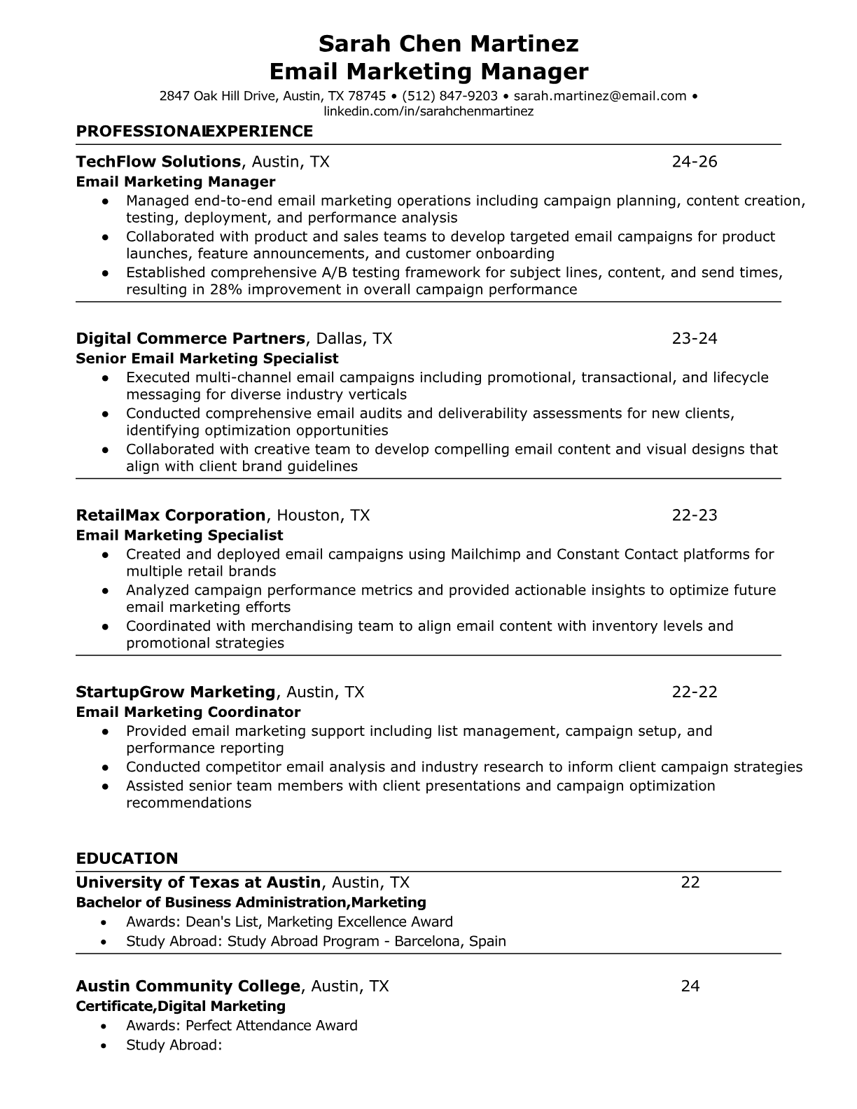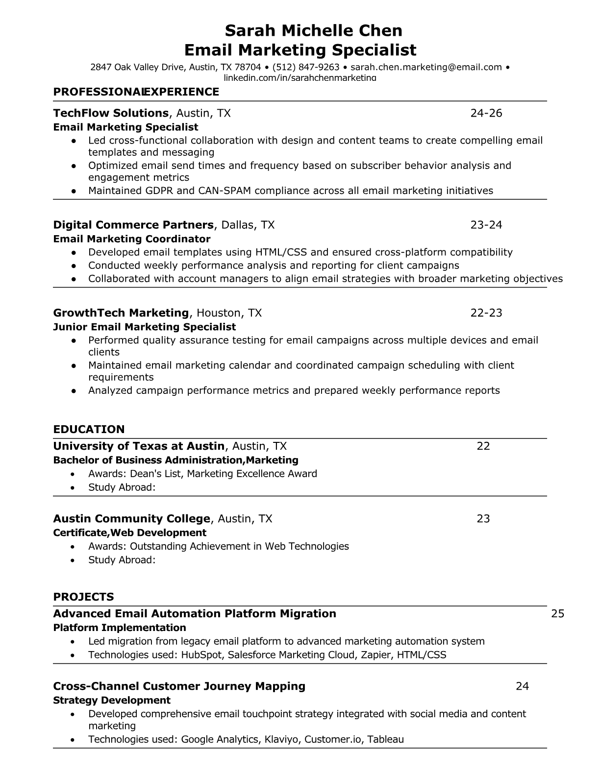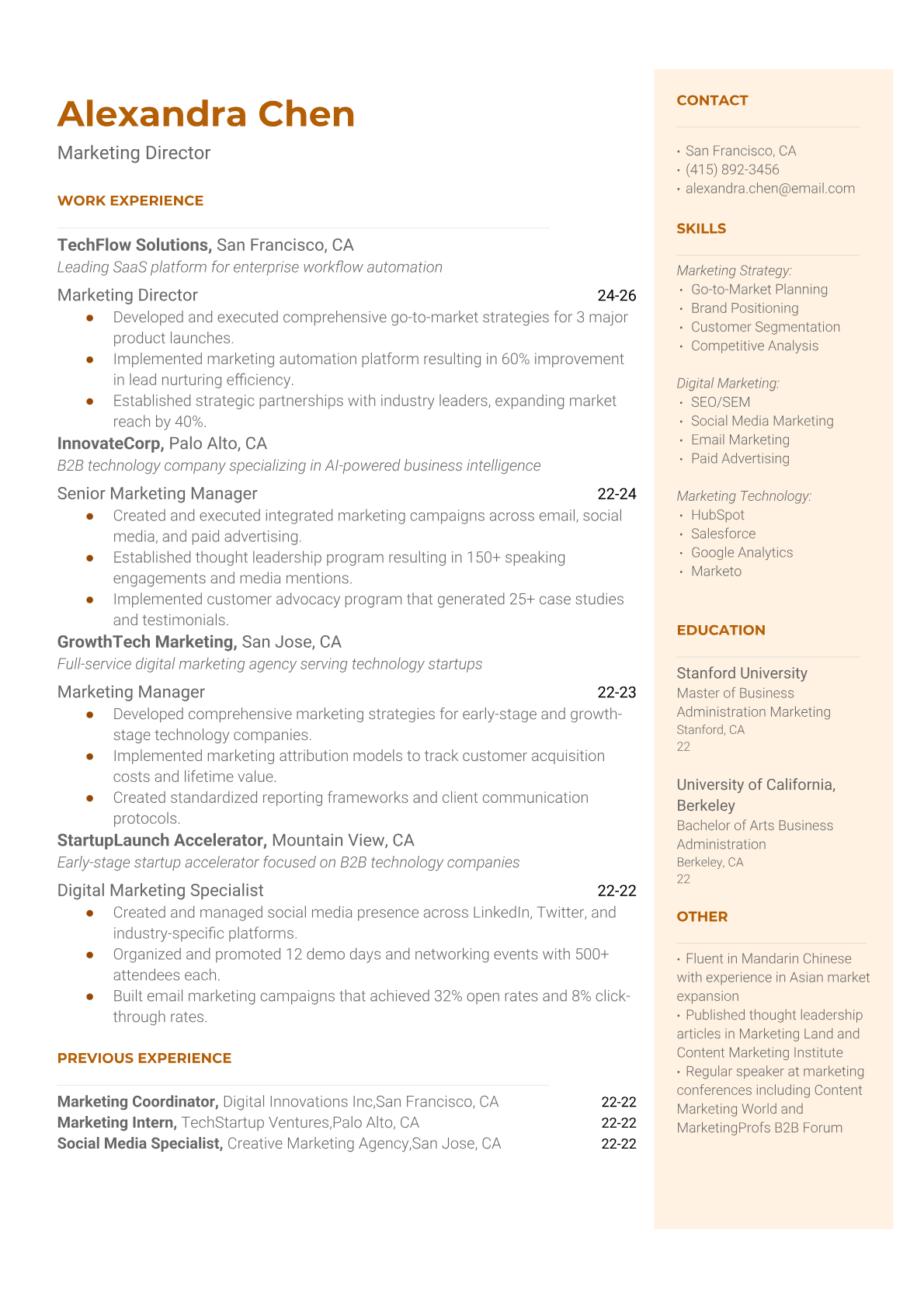 Browse marketing resume examples and modern templates for digital, content, growth and brand marketers. Emphasize campaign results, acquisition metrics and cross-channel strategy in an ATS-friendly format.