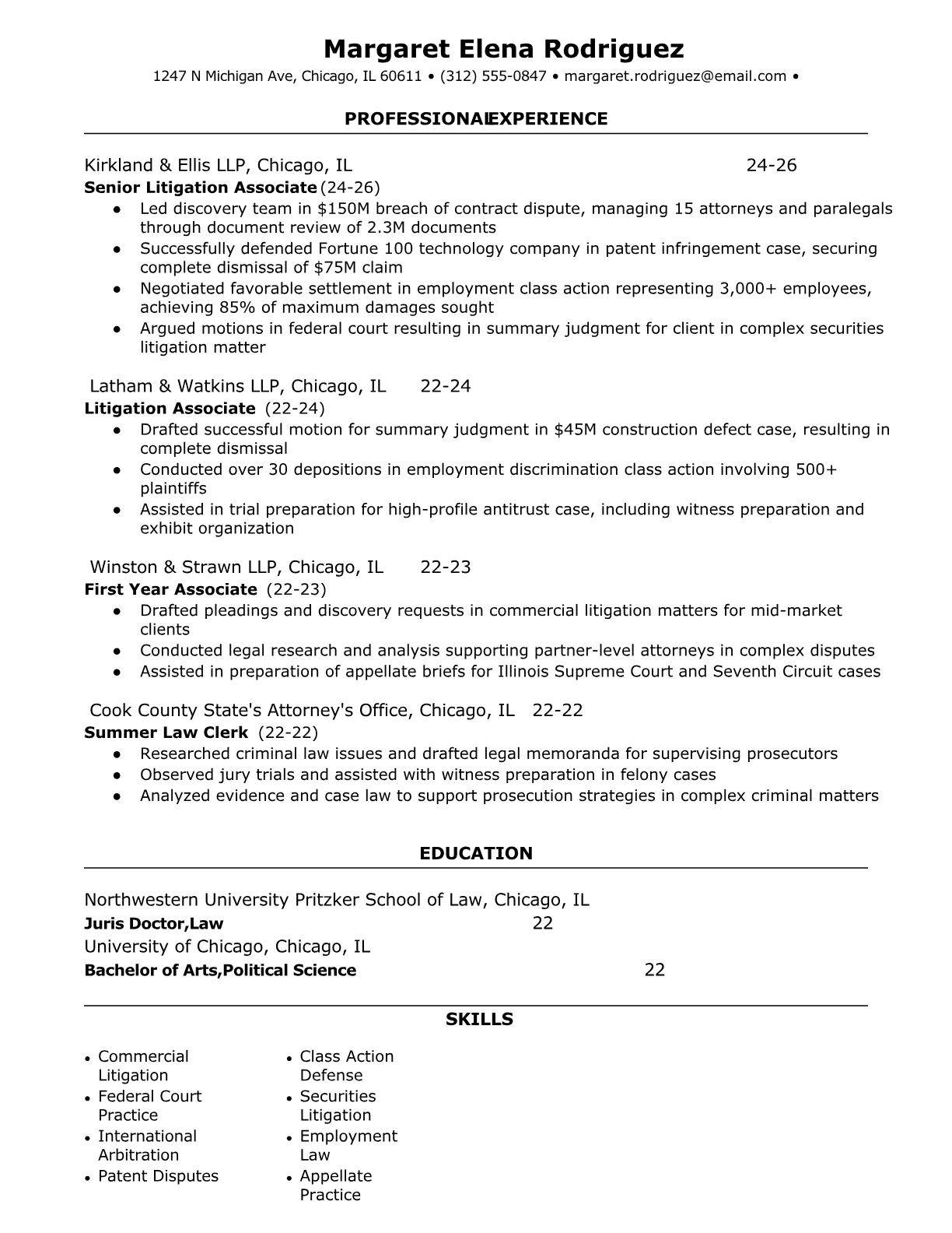 A Litigation Attorney represents clients in civil and criminal court proceedings, handling everything from case research and discovery to trial advocacy and settlement negotiations. They specialize in dispute resolution, working on complex legal matters that require extensive knowledge of procedural law, evidence rules, and courtroom strategy. The role demands strong analytical skills, persuasive communication, and the ability to manage high-stakes cases under tight deadlines. An ATS-friendly resume is crucial because law firms and legal departments increasingly use automated screening systems to filter candidates based on specific practice areas, bar admissions, and case experience. Without proper keyword optimization and clear formatting, even experienced litigators may be overlooked before human recruiters can evaluate their qualifications.