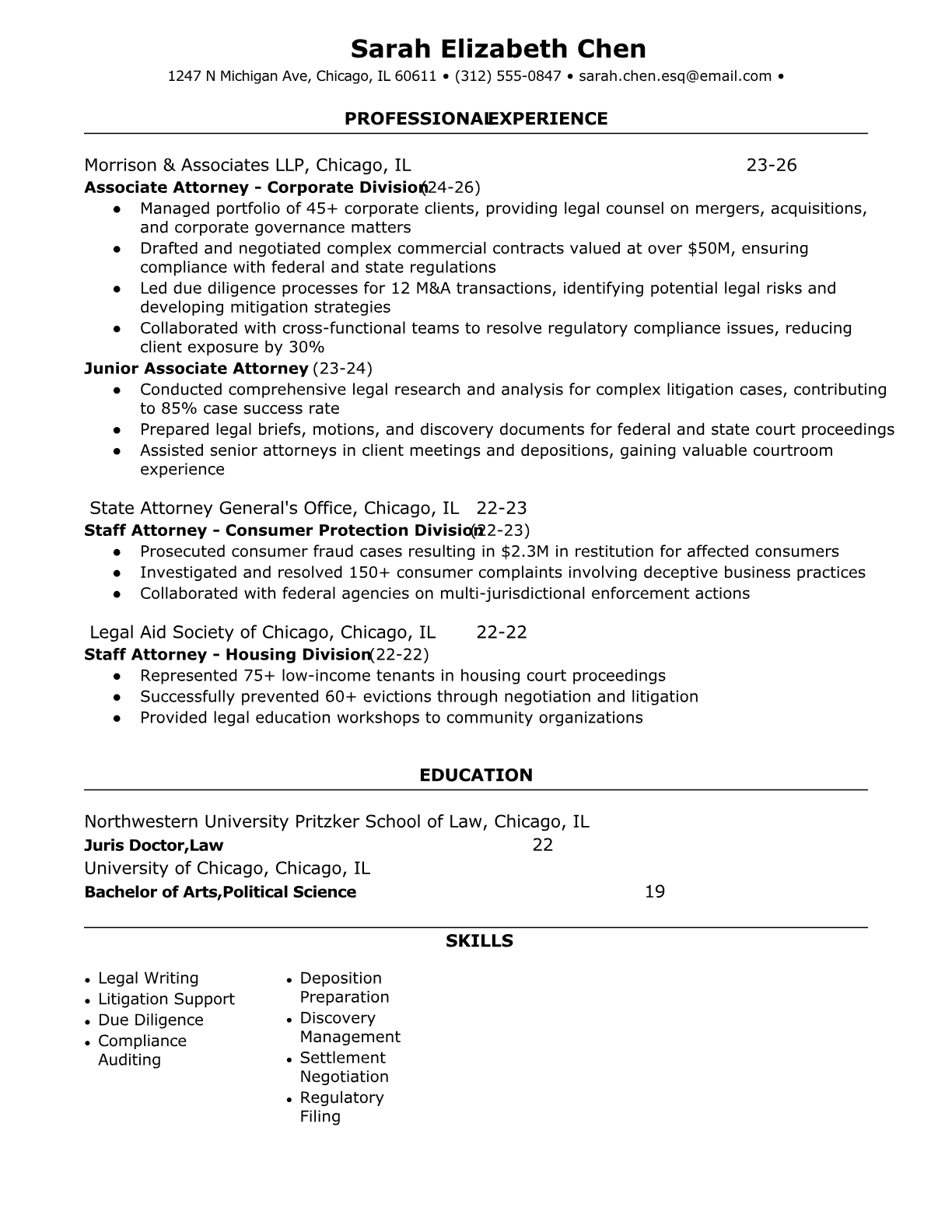 An Associate Attorney provides legal research, drafts documents, assists with case preparation, and supports senior attorneys in litigation, corporate transactions, or regulatory matters. They work across various practice areas including corporate law, litigation, real estate, and employment law, often serving as the primary point of contact for clients on routine legal matters. The role requires strong analytical skills, attention to detail, and the ability to manage multiple cases simultaneously. An ATS-friendly resume is crucial for Associate Attorney positions because law firms and legal departments use sophisticated screening systems to filter candidates based on practice area experience, bar admissions, law school credentials, and specific legal software proficiency. Without proper keyword optimization and clear formatting, qualified attorneys may be overlooked before reaching hiring partners or legal recruiters.