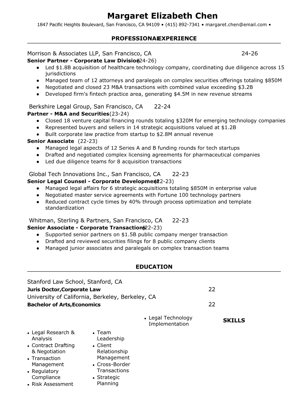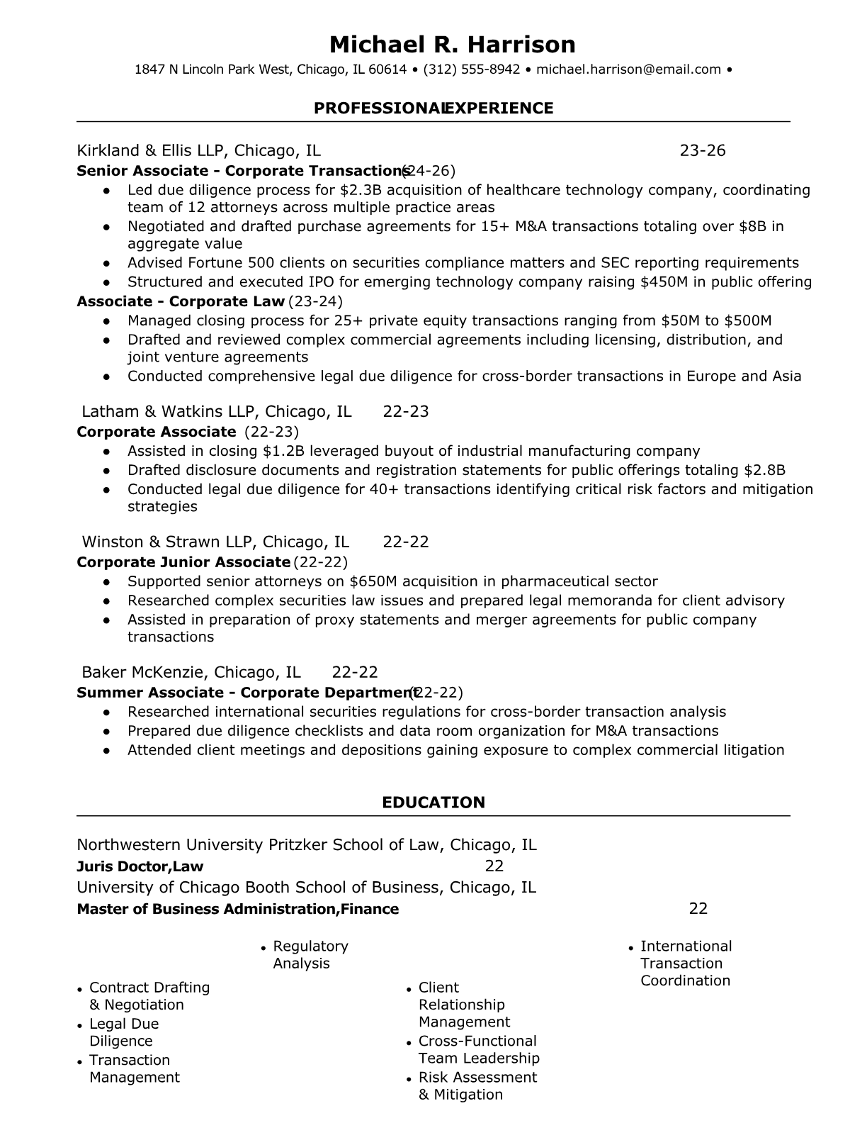 A Corporate Attorney provides legal counsel to businesses on matters including contracts, mergers and acquisitions, regulatory compliance, corporate governance, and risk management. They draft and negotiate complex commercial agreements, advise executives on legal implications of business decisions, and ensure corporate operations comply with applicable laws and regulations. Corporate attorneys typically work in-house at corporations or at law firms serving business clients. An ATS-friendly resume is crucial for corporate attorney positions because law firms and corporate legal departments use sophisticated screening systems to filter candidates based on specific practice areas, bar admissions, deal experience, and regulatory expertise. Without proper keyword optimization and clear formatting, even highly qualified attorneys may be filtered out before reaching hiring managers or legal recruiters.
