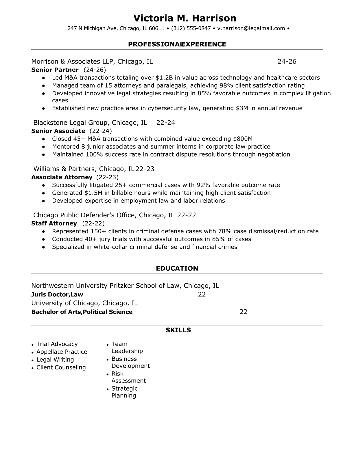 An Experienced Attorney provides legal counsel, represents clients in court proceedings, drafts complex legal documents, and manages high-stakes litigation or transactional matters. They typically specialize in areas like corporate law, litigation, intellectual property, or regulatory compliance, working at law firms, corporations, or government agencies. These attorneys handle sophisticated legal issues requiring deep expertise and strategic thinking. ATS-friendly resumes are crucial for experienced attorneys because law firms and legal departments increasingly use automated screening systems to filter candidates based on practice areas, bar admissions, and specific legal technologies. Without proper keyword optimization and clear formatting, even highly qualified attorneys may be overlooked before reaching hiring partners or legal recruiters.