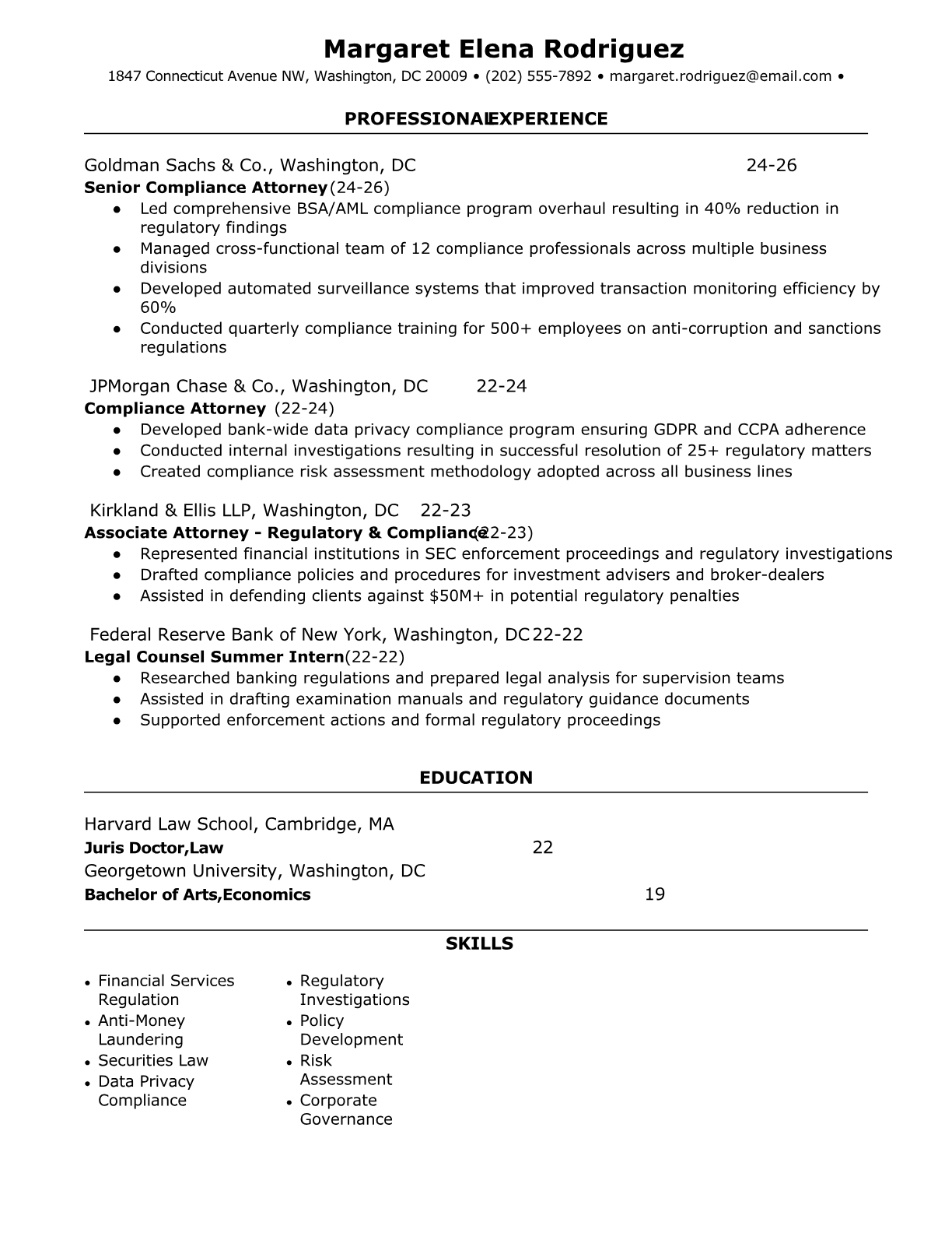 A Compliance Attorney ensures organizations adhere to legal regulations, industry standards, and internal policies across various sectors like finance, healthcare, and technology. They develop compliance programs, conduct risk assessments, investigate violations, and provide legal guidance to prevent regulatory breaches while working closely with business units to implement effective compliance frameworks. An ATS-friendly resume is crucial for Compliance Attorneys because law firms and corporations use sophisticated screening systems to filter candidates based on specific regulatory expertise, certifications, and industry knowledge. Without proper keyword optimization and clear formatting, qualified attorneys may be overlooked before human recruiters can assess their specialized compliance experience.
