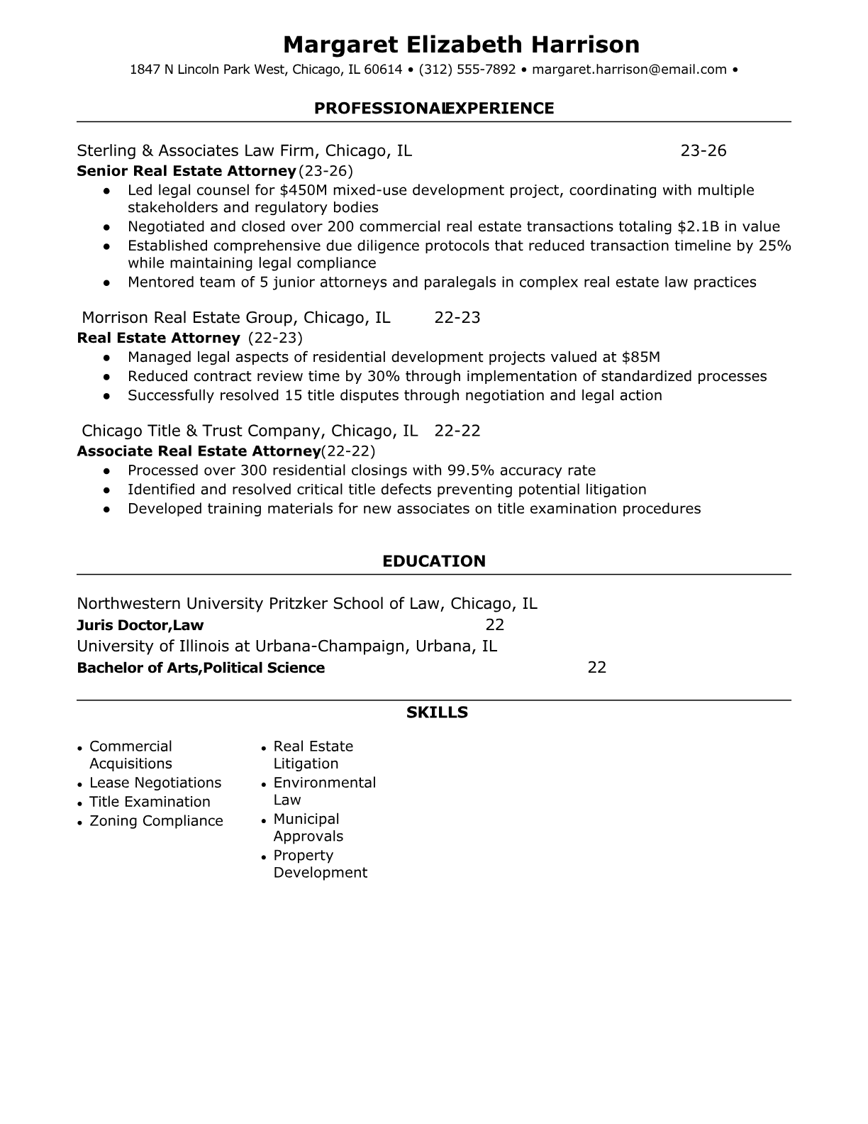 A Real Estate Attorney specializes in legal matters involving property transactions, zoning laws, land use regulations, and real estate development. They handle contract negotiations, title examinations, closings, litigation, and regulatory compliance for residential and commercial properties. These attorneys work with developers, investors, lenders, and individual buyers to navigate complex real estate laws and ensure legally sound transactions. An ATS-friendly resume is crucial because law firms and corporate legal departments use sophisticated screening systems to filter candidates based on specific legal specializations, bar admissions, and transaction experience. Without proper keyword optimization and clear formatting, qualified real estate attorneys may be overlooked before human recruiters can evaluate their expertise.
