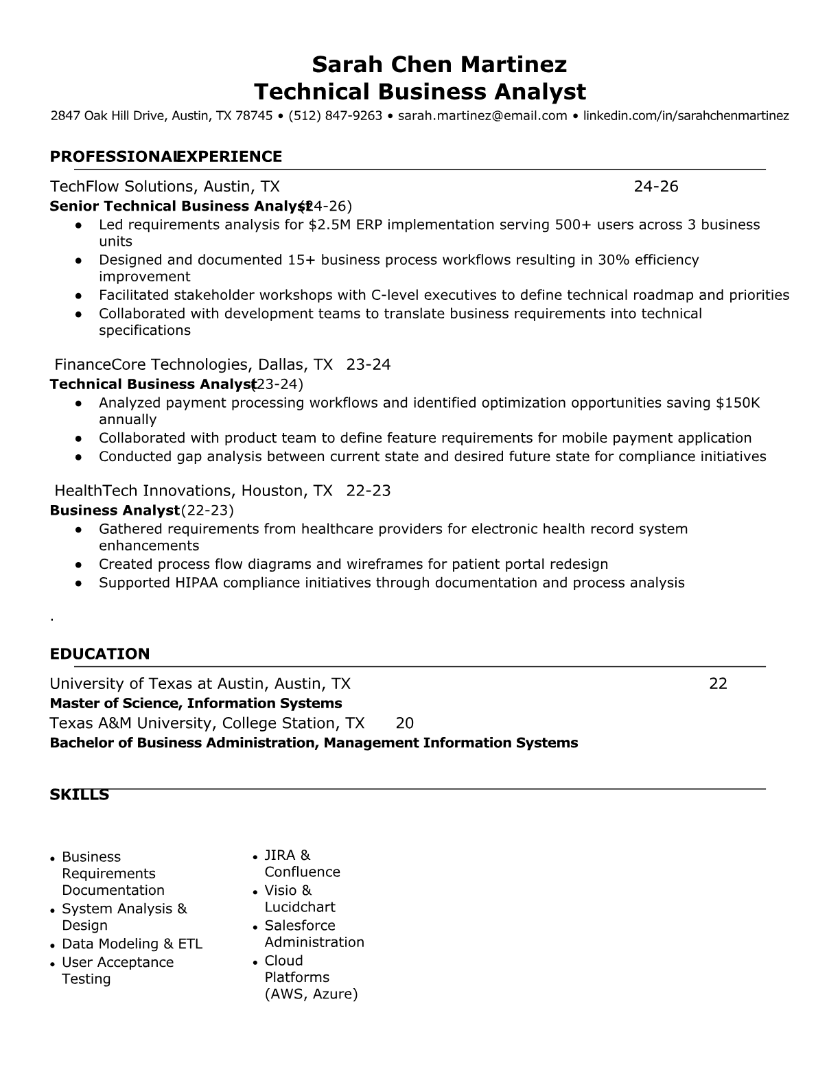 A Technical Business Analyst bridges the gap between business stakeholders and technical teams, translating complex business requirements into technical specifications. They analyze business processes, gather requirements, create documentation, and work closely with developers to ensure solutions meet business needs. The role requires strong analytical skills, technical understanding, and excellent communication abilities to facilitate collaboration between business and IT departments. An ATS-friendly resume is crucial for Technical Business Analyst positions because companies use automated screening to filter for specific technical tools, methodologies, and business analysis frameworks. Recruiters look for keywords like SQL, Agile, JIRA, requirements gathering, and process mapping, so proper formatting and keyword placement can make the difference between getting an interview or being filtered out.