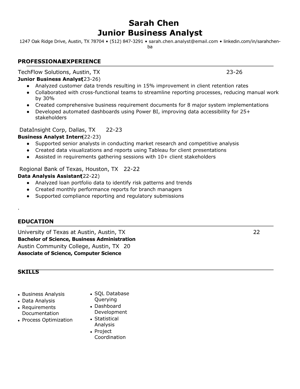 A Junior Business Analyst bridges the gap between business needs and technical solutions by gathering requirements, analyzing processes, and documenting workflows. They work closely with stakeholders to identify inefficiencies, create process maps, and support project implementations across various departments and systems. An ATS-friendly resume is crucial for Junior Business Analyst positions because most companies use automated screening to filter for specific methodologies, tools, and analytical skills. Without proper keyword optimization and clear formatting, qualified candidates often get filtered out before recruiters can evaluate their problem-solving abilities and business acumen.
