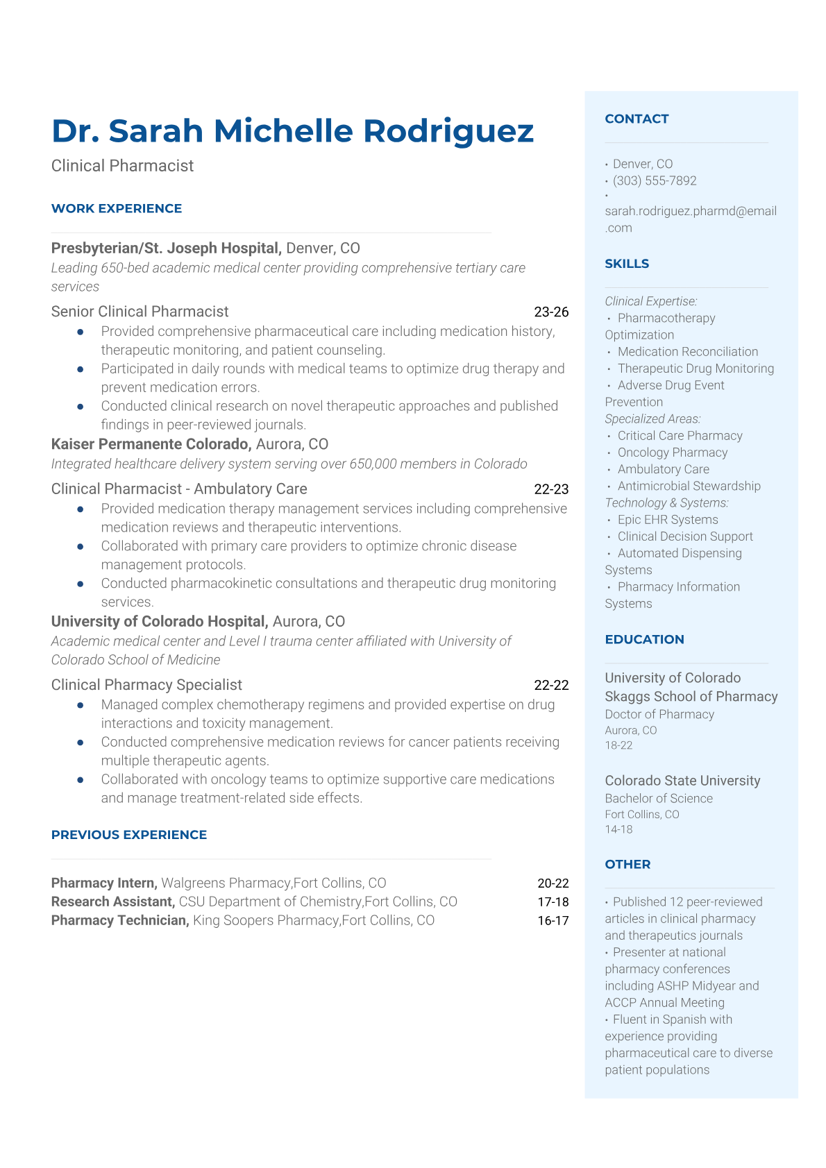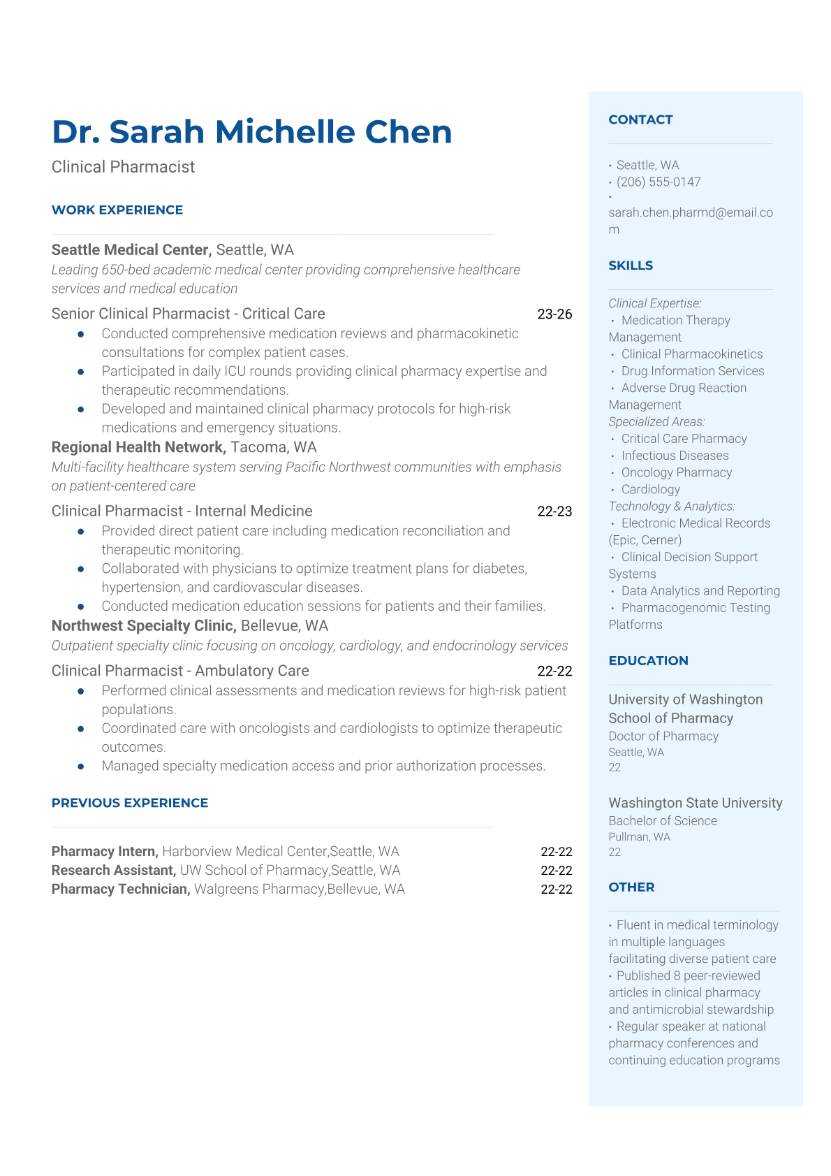 A Clinical Pharmacist provides direct patient care by reviewing medications, monitoring drug therapy outcomes, and collaborating with healthcare teams to optimize pharmaceutical treatment plans. They work in hospitals, clinics, and healthcare systems to ensure medication safety, manage drug interactions, and provide clinical expertise on complex pharmaceutical cases. The role requires extensive knowledge of pharmacology, patient assessment skills, and the ability to make critical decisions about drug therapy. An ATS-friendly resume is crucial for Clinical Pharmacists because healthcare organizations use sophisticated screening systems to filter candidates based on specific certifications, clinical experience, and specialized pharmaceutical knowledge. Without proper keyword optimization for terms like clinical pharmacy, medication therapy management, and relevant certifications, qualified pharmacists may be overlooked before human recruiters review their applications.