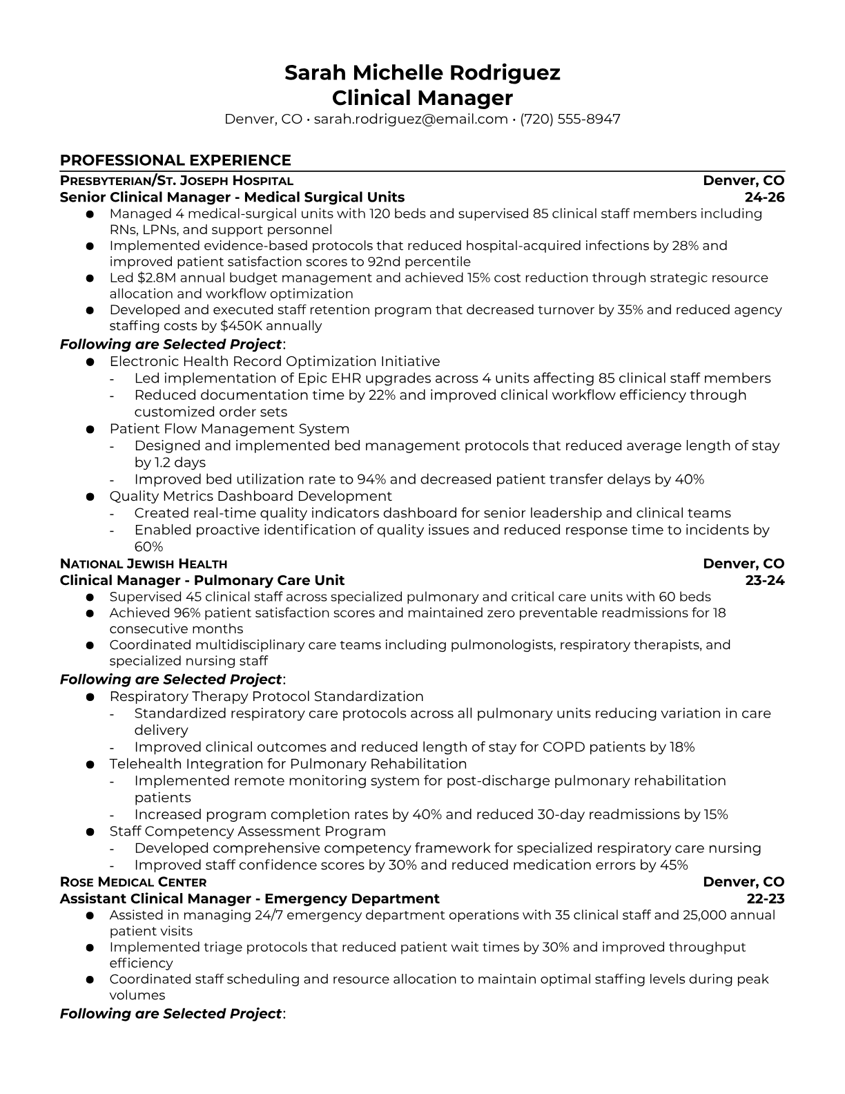 A Clinical Manager oversees healthcare operations, managing clinical staff, ensuring quality patient care, and maintaining compliance with healthcare regulations and standards. They coordinate between medical teams, handle budgets, implement policies, and work to improve patient outcomes while managing day-to-day clinical operations in hospitals, clinics, or healthcare facilities. An ATS-friendly resume is crucial for Clinical Manager positions because healthcare organizations use sophisticated screening systems to filter for specific clinical certifications, management experience, and regulatory compliance knowledge. Without proper keyword optimization for terms like patient safety, quality improvement, and healthcare management, qualified candidates may be overlooked before reaching hiring managers.
