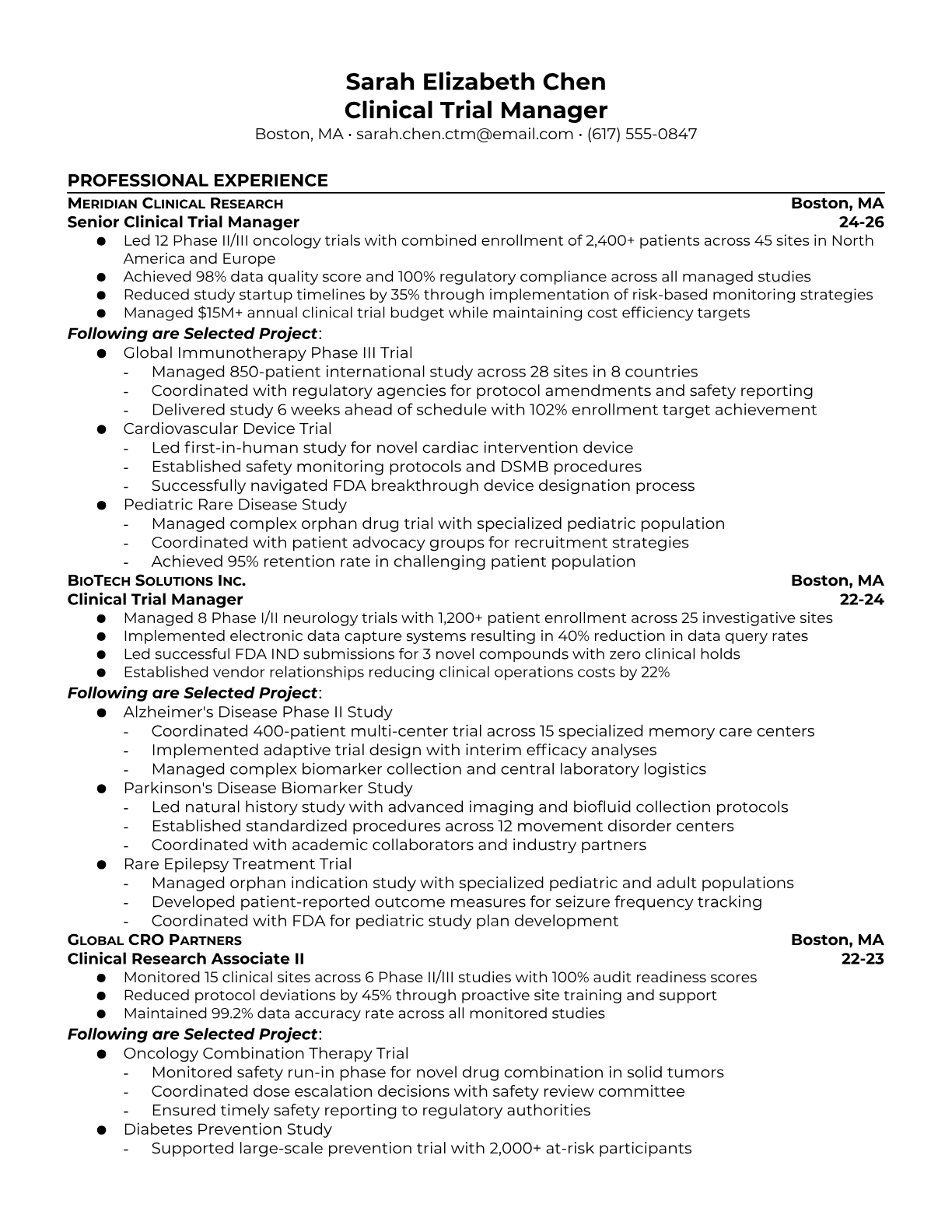 A Clinical Trial Manager oversees the planning, execution, and monitoring of clinical research studies to ensure they meet regulatory requirements and scientific objectives. They coordinate with investigators, sponsors, and regulatory bodies while managing budgets, timelines, and compliance with FDA and ICH-GCP guidelines. The role requires strong project management skills, deep knowledge of clinical research protocols, and the ability to navigate complex regulatory environments. An ATS-friendly resume is crucial for Clinical Trial Manager positions because pharmaceutical companies and CROs use sophisticated screening systems to filter candidates based on specific certifications, therapeutic areas, and regulatory experience. Without proper keyword optimization for terms like GCP, FDA submissions, protocol development, and clinical data management, qualified candidates may be overlooked before human reviewers see their applications.