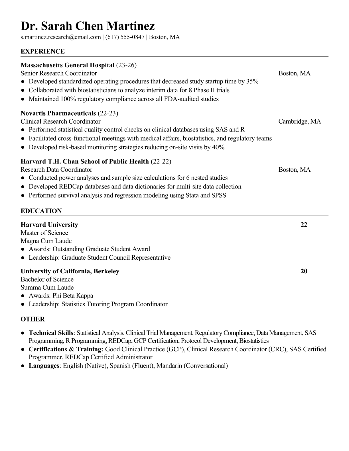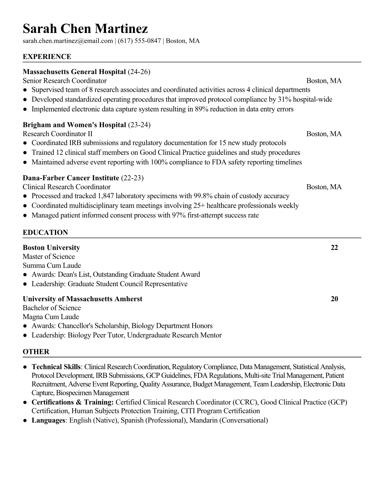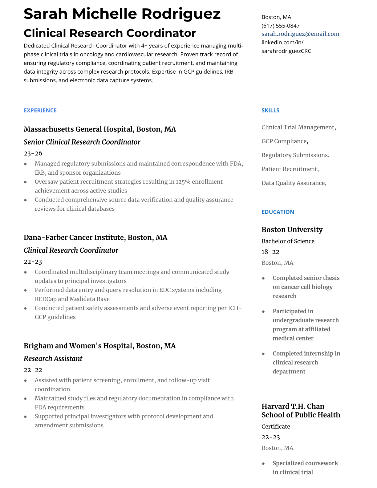 A Clinical Research Coordinator manages and oversees clinical trials, ensuring compliance with regulatory requirements while coordinating patient recruitment, data collection, and protocol adherence. They work closely with principal investigators, study sponsors, and regulatory bodies to execute research studies that advance medical knowledge and bring new treatments to market. The role requires strong organizational skills, attention to detail, and knowledge of Good Clinical Practice (GCP) guidelines. An ATS-friendly resume is crucial for Clinical Research Coordinators because healthcare organizations and contract research organizations use automated systems to screen for specific certifications, regulatory knowledge, and clinical trial experience. Without proper keyword optimization for terms like GCP, FDA regulations, ICH guidelines, and clinical data management systems, qualified candidates may be filtered out before human reviewers see their applications.