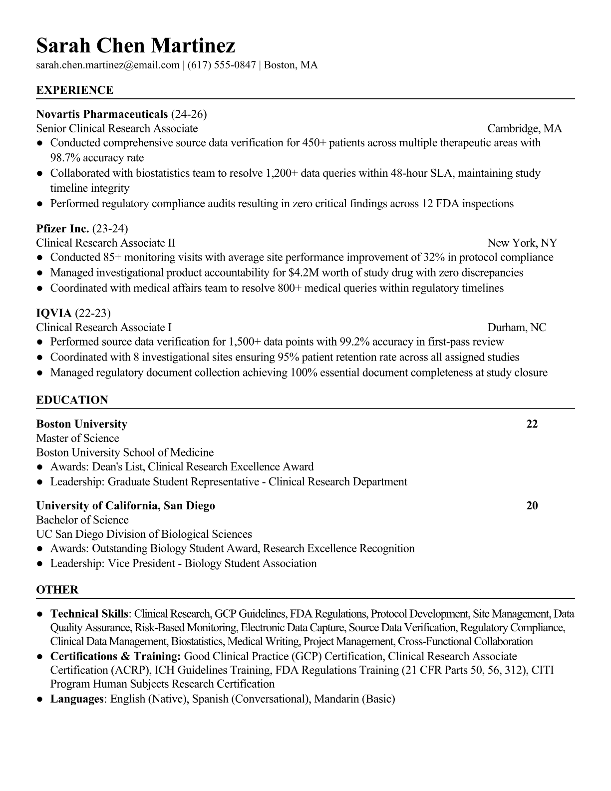 A Clinical Research Associate monitors and manages clinical trials to ensure compliance with regulatory standards and protocols. They conduct site visits, review patient data, verify source documents, and ensure Good Clinical Practice (GCP) guidelines are followed throughout pharmaceutical and medical device studies. The role requires strong attention to detail, knowledge of FDA regulations, and the ability to work with research sites, sponsors, and regulatory bodies. An ATS-friendly resume is crucial for Clinical Research Associate positions because pharmaceutical companies and CROs use sophisticated screening systems to filter candidates based on specific certifications, regulatory knowledge, and therapeutic area experience. Without proper keyword optimization for terms like GCP, FDA regulations, clinical monitoring, and specific therapeutic areas, qualified candidates may be automatically filtered out before human review.