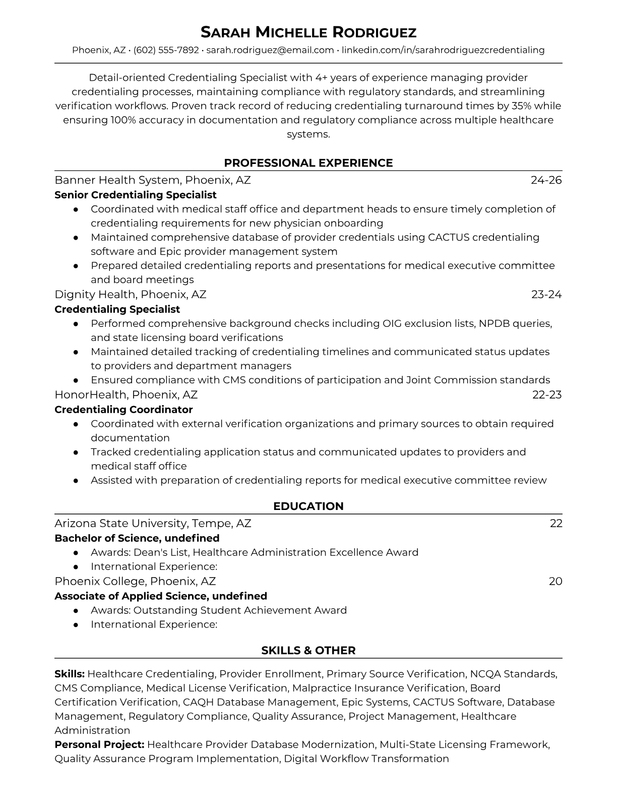 A Credentialing Specialist manages the verification and maintenance of professional licenses, certifications, and qualifications for healthcare providers, insurance networks, or professional organizations. They review applications, verify education and training credentials, conduct background checks, and ensure compliance with regulatory standards and organizational policies. The role requires strong attention to detail, knowledge of credentialing requirements, and the ability to work with multiple databases and verification systems. An ATS-friendly resume is crucial for credentialing positions because healthcare organizations and staffing agencies use automated systems to screen for specific compliance knowledge, software proficiencies, and regulatory experience. Without proper keyword optimization for terms like CAQH, NCQA standards, provider enrollment, and credentialing software, qualified candidates may be filtered out before human review.