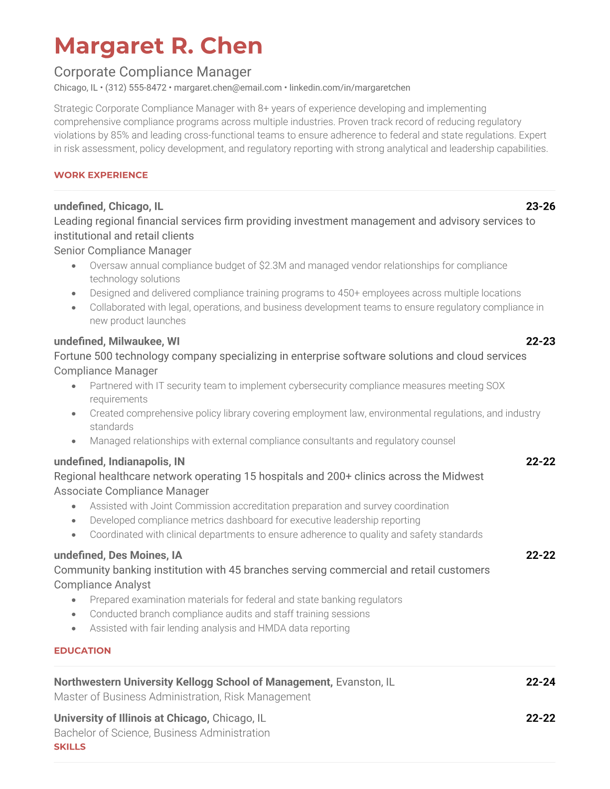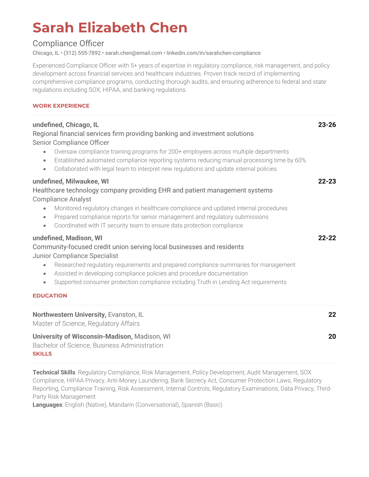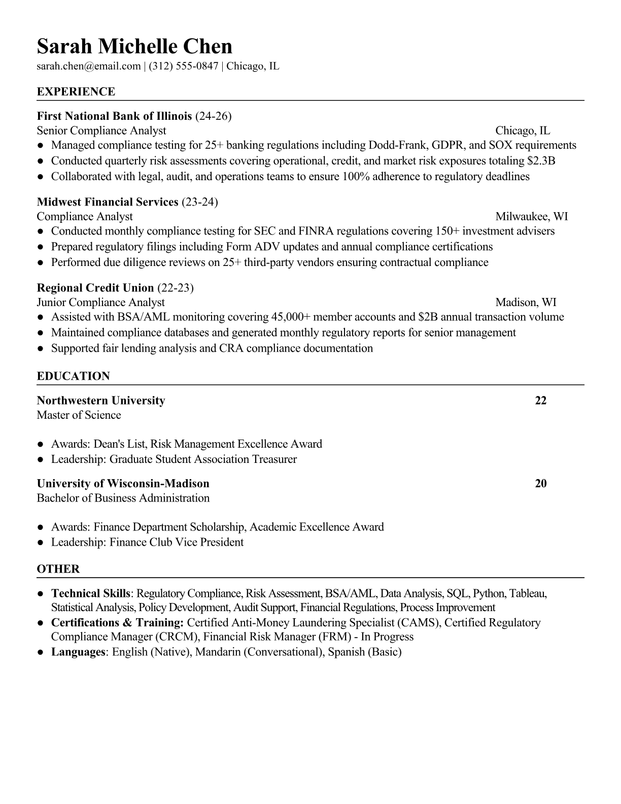 Professional compliance resume examples and templates. Get expert tips to showcase your regulatory knowledge and risk management skills.