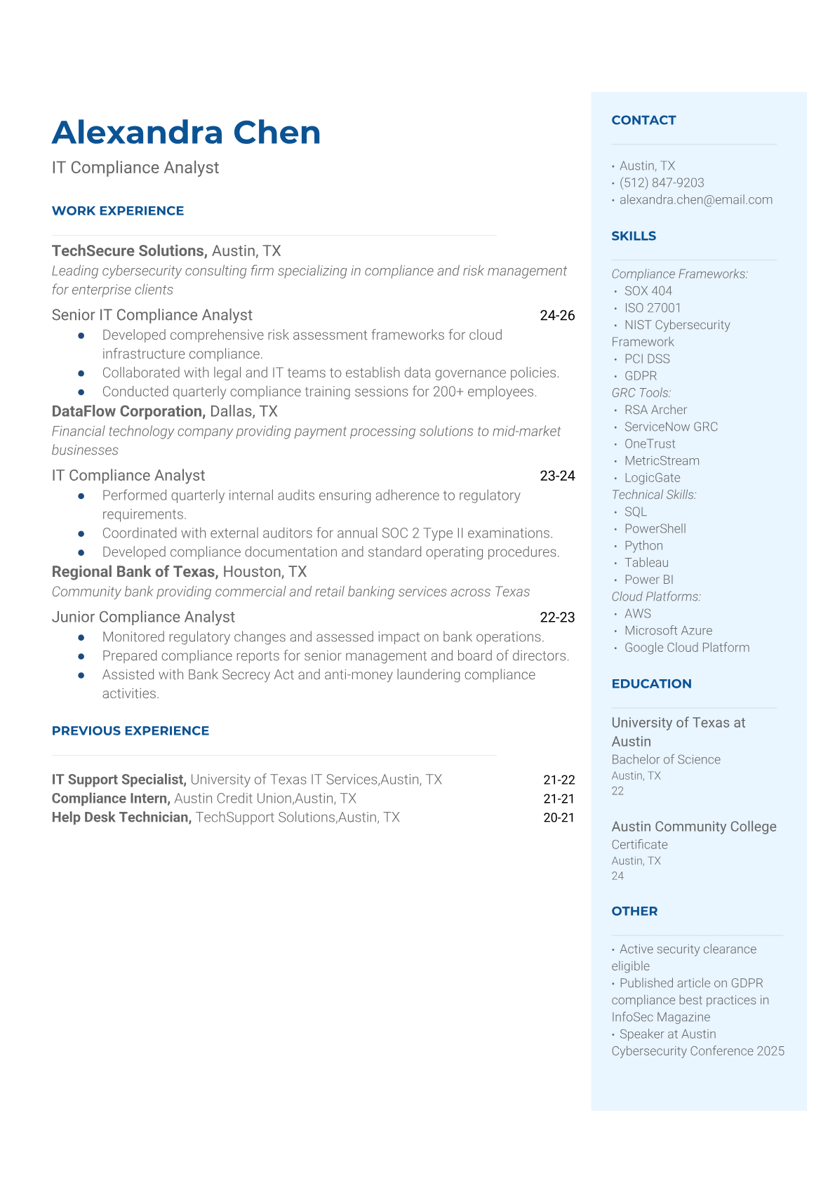 An IT Compliance Analyst ensures that an organization's technology systems and processes meet regulatory requirements and industry standards. They conduct risk assessments, develop compliance policies, monitor security controls, and work with IT teams to implement frameworks like SOX, HIPAA, PCI-DSS, or ISO 27001. The role requires strong technical knowledge combined with understanding of legal and regulatory requirements. An ATS-friendly resume is crucial because compliance roles are heavily screened for specific certifications, regulatory frameworks, and technical skills. Recruiters and automated systems look for exact keyword matches related to compliance standards, audit tools, and risk management methodologies, making proper formatting and keyword optimization essential for getting past initial screening.