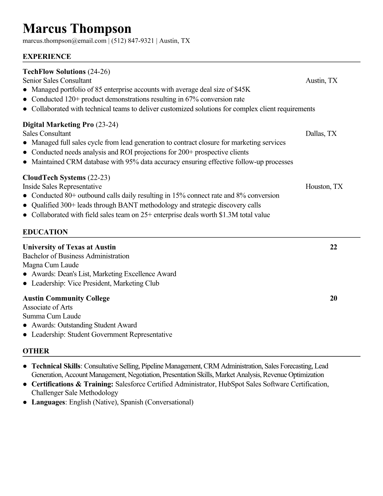 A Sales Consultant builds relationships with clients to understand their needs and recommend products or services that drive revenue growth. They manage the entire sales cycle from lead generation and prospecting to closing deals and maintaining long-term customer relationships. The role requires strong communication skills, product knowledge, and the ability to meet sales targets while providing exceptional customer service. An ATS-friendly resume is crucial because most companies use automated screening to filter for specific sales metrics, CRM experience, and industry keywords. Sales roles are highly competitive, and recruiters often search for quantifiable achievements like revenue generated, quota attainment, and client retention rates to identify top performers.
