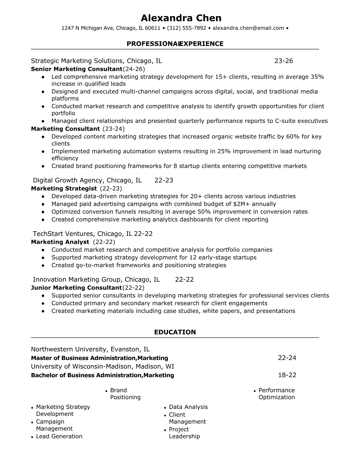 A Marketing Consultant develops strategic marketing plans and campaigns for businesses across various industries. They analyze market trends, consumer behavior, and competitive landscapes to create data-driven recommendations that drive brand awareness, lead generation, and revenue growth. Marketing Consultants work with diverse clients, from startups to Fortune 500 companies, providing expertise in digital marketing, brand positioning, and campaign optimization. An ATS-friendly resume is crucial for Marketing Consultants because agencies and corporations use automated screening to filter for specific marketing tools, certifications, and industry experience. Without proper keyword optimization and clear formatting, qualified consultants may be overlooked before recruiters can assess their strategic thinking and campaign success metrics.