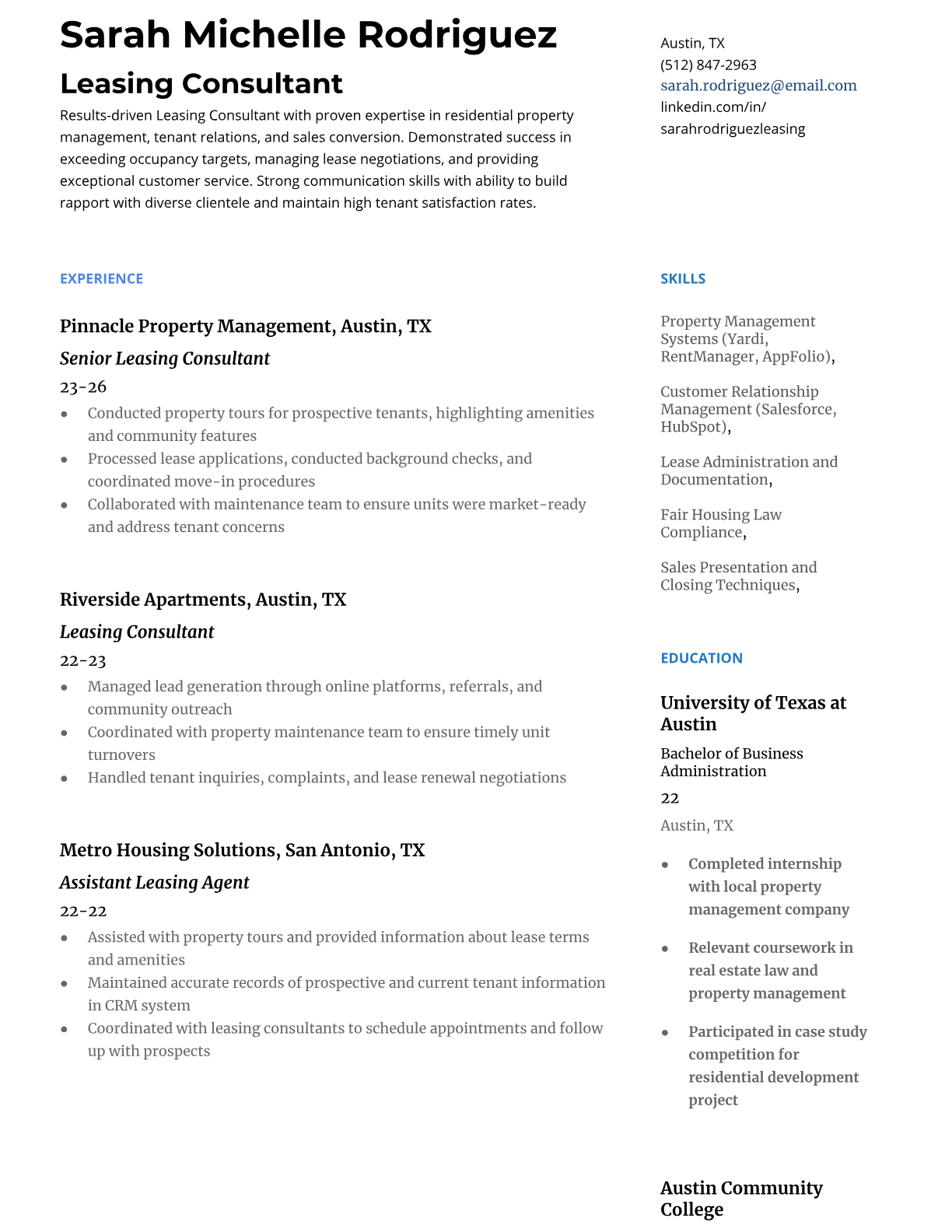 A Leasing Consultant serves as the primary point of contact for prospective and current tenants at residential or commercial properties. They conduct property tours, process rental applications, negotiate lease terms, and maintain tenant relationships while ensuring occupancy goals are met. The role requires strong sales skills, property management knowledge, and the ability to handle multiple prospects simultaneously. An ATS-friendly resume is crucial for leasing consultant positions because property management companies and real estate firms heavily rely on automated screening to filter candidates based on sales metrics, property management software experience, and customer service keywords. Without proper formatting and industry-specific terms, qualified candidates may be overlooked before reaching hiring managers.