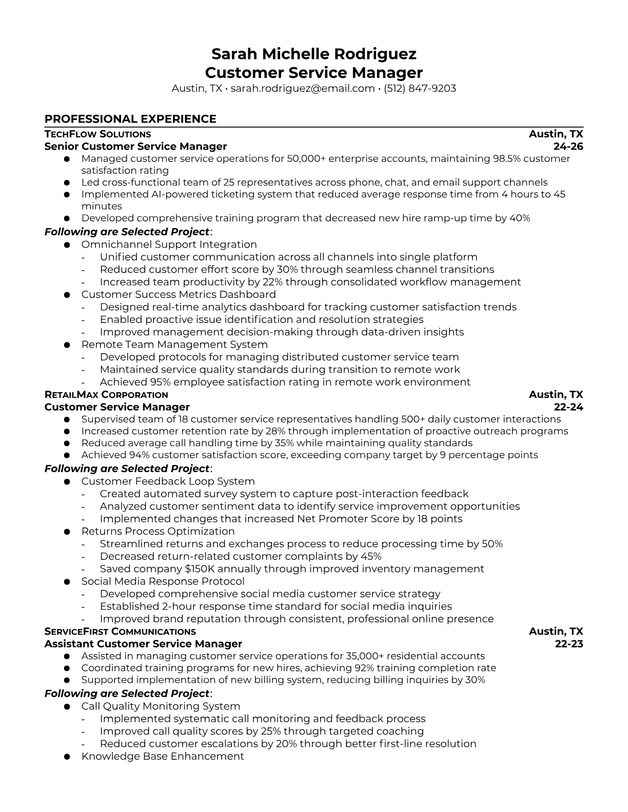 A Customer Service Manager leads customer support teams and develops service strategies to ensure exceptional customer experiences. They oversee daily operations, manage escalations, implement service improvements, and work cross-functionally with sales, product, and operations teams to drive customer satisfaction and retention metrics. ATS systems in customer service roles heavily screen for leadership keywords, customer satisfaction metrics, team management experience, and specific CRM platforms. Without proper keyword optimization and clear demonstration of both people management and customer service expertise, qualified candidates often get filtered out before human review.
