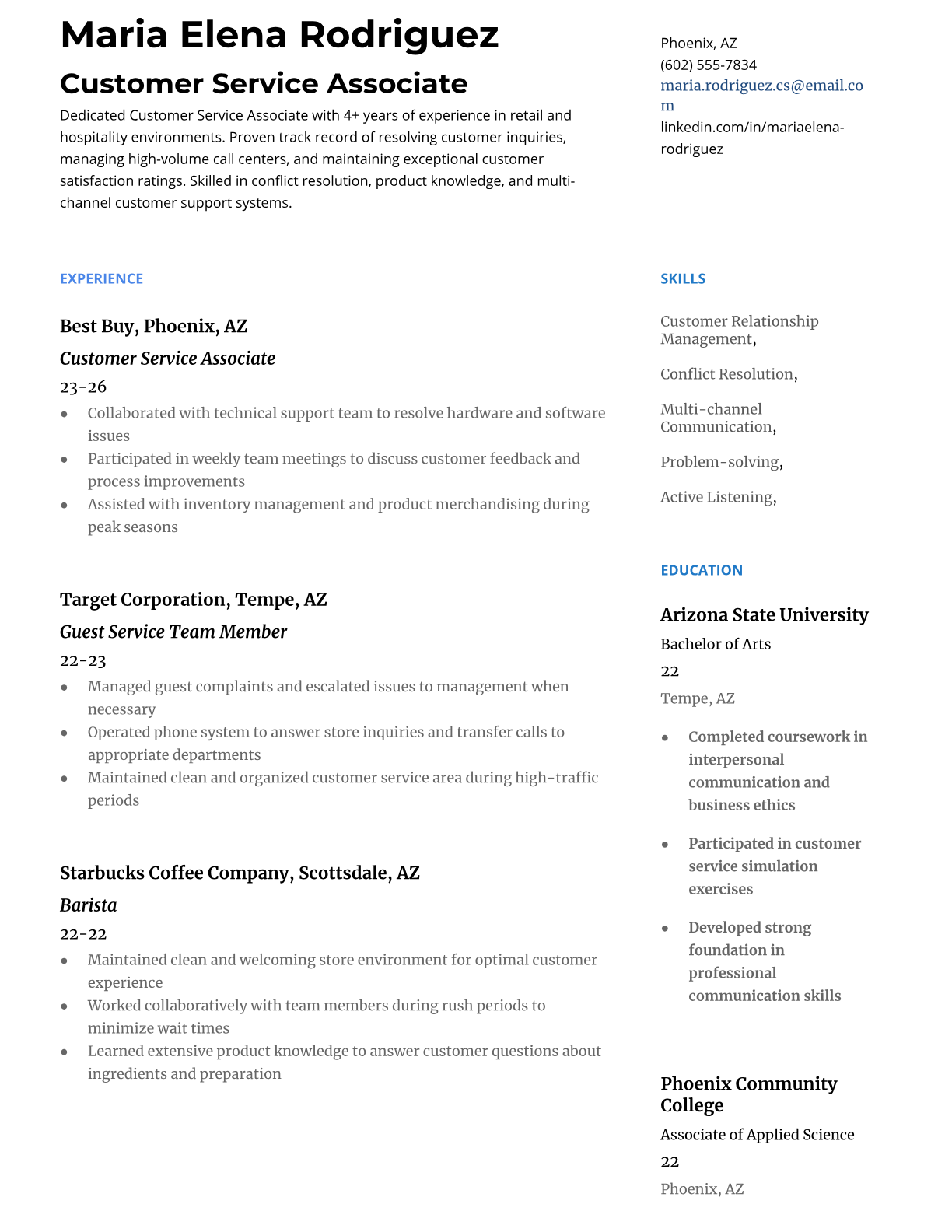 A Customer Service Associate serves as the primary point of contact between a company and its customers, handling inquiries, resolving complaints, and providing product or service information across multiple channels including phone, email, chat, and in-person interactions. They work to ensure customer satisfaction while maintaining company policies and procedures, often using CRM systems to track interactions and escalate complex issues to supervisors. An ATS-friendly resume is crucial for Customer Service Associate positions because most companies use automated screening systems to filter candidates based on specific keywords like customer satisfaction, conflict resolution, and communication skills. Without proper formatting and relevant terminology, qualified candidates may be overlooked before human recruiters can evaluate their interpersonal abilities and service experience.