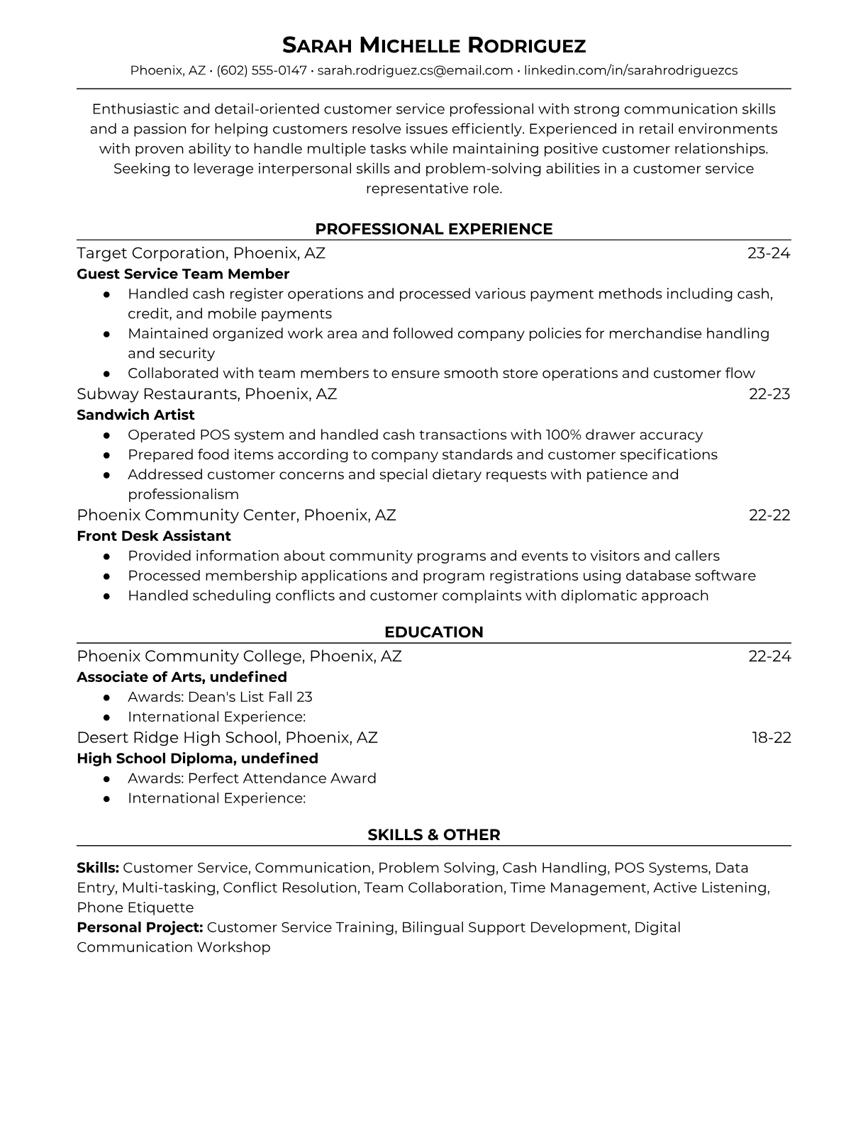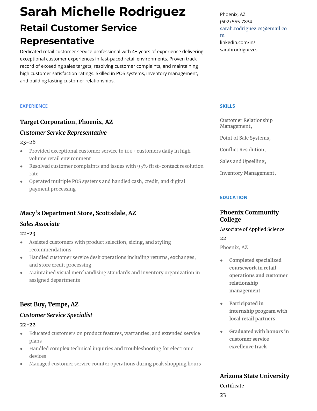 A Retail Customer Service Representative serves as the front-line contact between customers and retail businesses, handling inquiries, processing transactions, resolving complaints, and ensuring positive shopping experiences. They work in various retail environments from department stores to specialty shops, managing cash registers, inventory assistance, and product recommendations while maintaining store standards and sales goals. An ATS-friendly resume is crucial for retail customer service roles because major retailers like Target, Walmart, and Best Buy use automated screening systems to filter candidates based on customer service keywords, retail experience, and soft skills. Without proper formatting and relevant terminology, qualified candidates may be overlooked before human recruiters can assess their people skills and retail aptitude.