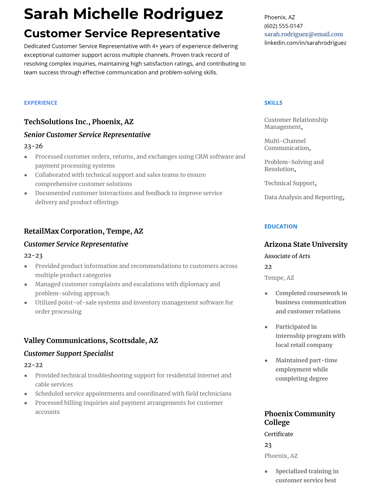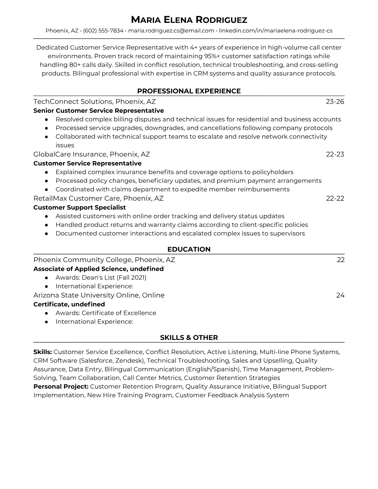 A Customer Service Representative serves as the primary point of contact between a company and its customers, handling inquiries, resolving complaints, and providing product or service information across multiple channels including phone, email, chat, and social media. They work to ensure customer satisfaction while maintaining company policies and often use CRM systems to track interactions and escalate complex issues to specialized teams. An ATS-friendly resume is crucial for customer service roles because most companies use automated screening to filter for specific soft skills, communication abilities, and experience with customer service software. Without proper keywords like 'conflict resolution,' 'CRM,' or 'customer retention,' qualified candidates may be filtered out before recruiters can assess their people skills and service orientation.