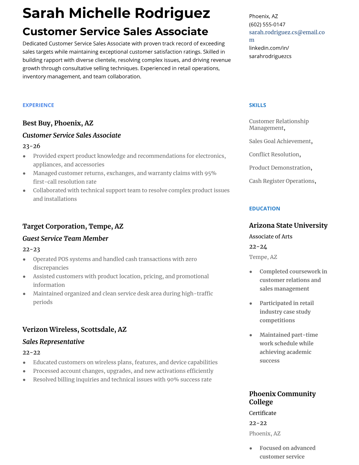 A Customer Service Sales Associate combines customer support with sales responsibilities, helping customers resolve issues while identifying opportunities to upsell products or services. They work in retail stores, call centers, or online platforms, managing customer inquiries, processing returns, and meeting sales targets while maintaining high satisfaction scores. An ATS-friendly resume is crucial because retail and customer service companies use automated systems to screen for specific skills like CRM software, sales metrics, and customer service keywords. Without proper formatting and relevant terminology, qualified candidates often get filtered out before human recruiters can evaluate their communication skills and sales potential.