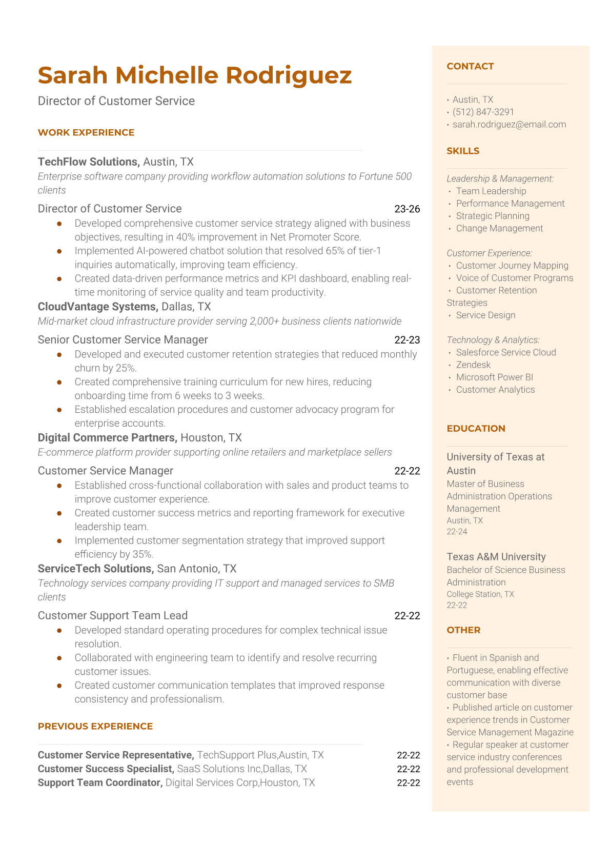 A Director of Customer Service leads customer support operations, managing teams of representatives, supervisors, and specialists to ensure exceptional customer experiences. They develop service strategies, implement quality assurance programs, oversee multichannel support operations, and drive customer satisfaction metrics while managing budgets and cross-functional partnerships with sales, product, and operations teams. An ATS-friendly resume is crucial for Director of Customer Service roles because companies use automated screening to filter for specific leadership experience, customer service platforms, and performance metrics. Without proper keyword optimization for terms like customer satisfaction scores, team management, and service delivery platforms, qualified executives may be filtered out before human recruiters can evaluate their leadership capabilities.