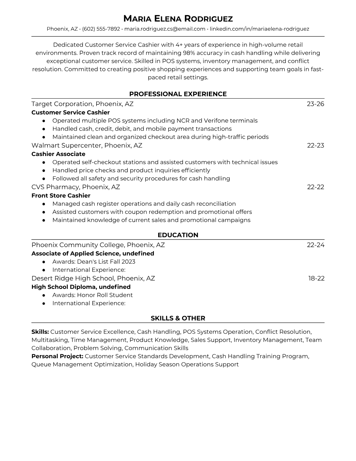 A Customer Service Cashier handles financial transactions, processes payments, and provides front-line customer support in retail environments. They operate point-of-sale systems, handle cash and card payments, resolve customer inquiries, and maintain accurate transaction records while ensuring positive customer experiences. An ATS-friendly resume is crucial for cashier positions because major retailers use automated screening systems to filter candidates based on customer service keywords, cash handling experience, and POS system familiarity. Without proper keyword optimization and clear formatting, qualified candidates may be automatically rejected before human recruiters review their applications.