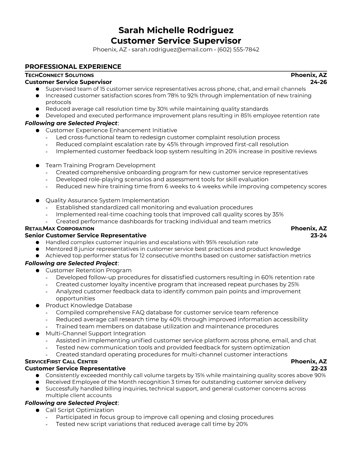 A Customer Service Supervisor leads frontline support teams, managing daily operations, coaching representatives, and ensuring service quality standards are met. They handle escalated customer issues, analyze performance metrics, implement process improvements, and serve as the bridge between upper management and customer service staff. The role requires strong leadership skills, conflict resolution abilities, and deep knowledge of customer service best practices. An ATS-friendly resume is crucial for Customer Service Supervisor positions because retail, telecommunications, and service companies use automated screening to filter for specific leadership experience, customer service metrics, and team management keywords. Without proper formatting and relevant terminology like 'team leadership,' 'customer satisfaction scores,' and 'call center operations,' qualified supervisors may be overlooked before human recruiters review their applications.