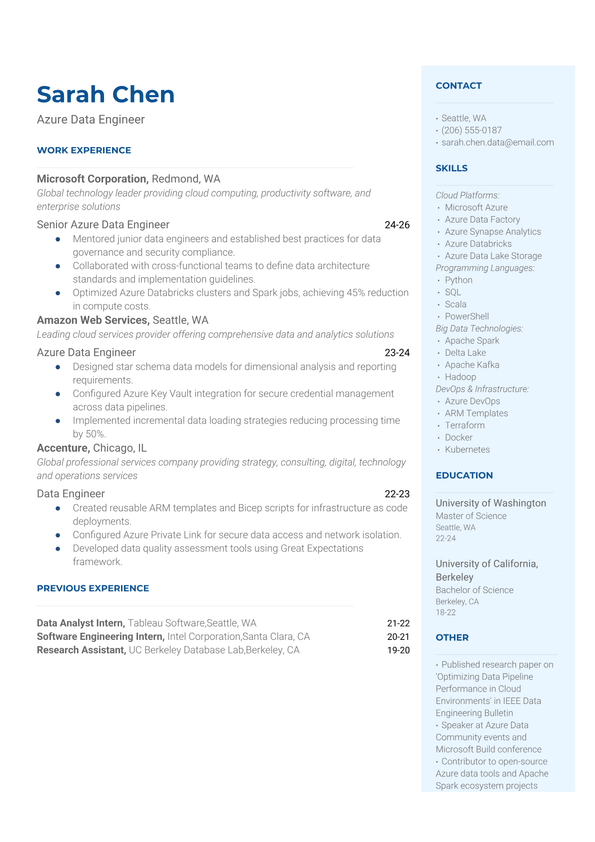An Azure Data Engineer designs, builds, and maintains data pipelines and analytics solutions on Microsoft's Azure cloud platform. They work with services like Azure Data Factory, Synapse Analytics, and Databricks to transform raw data into actionable insights for business intelligence and machine learning applications. The role requires expertise in both traditional data engineering concepts and Azure-specific tools and services. An ATS-friendly resume is crucial because Azure Data Engineer positions are highly competitive and most companies use automated screening to filter for specific Azure certifications, programming languages, and data tools. Without proper keyword optimization and clear technical skill presentation, qualified candidates often get filtered out before reaching hiring managers who understand the nuanced requirements of cloud data engineering.