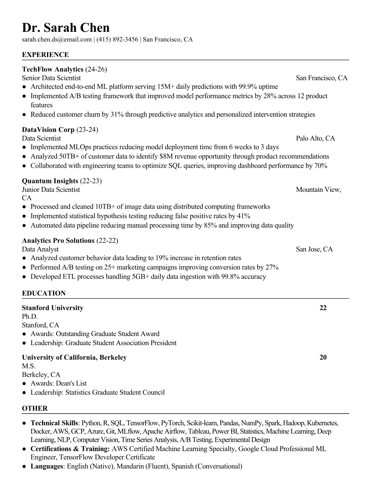 A Senior Data Scientist leads advanced analytics initiatives, developing machine learning models and statistical algorithms to solve complex business problems. They work with large datasets, collaborate with cross-functional teams, and translate data insights into strategic recommendations that drive organizational decision-making. The role requires expertise in programming languages like Python and R, along with deep knowledge of statistical modeling, machine learning frameworks, and data visualization tools. An ATS-friendly resume is crucial because tech companies and data-driven organizations use sophisticated screening systems that scan for specific technical skills, programming languages, and machine learning frameworks. Without proper keyword optimization and clear technical competency presentation, even highly qualified senior data scientists may be filtered out before reaching hiring managers or technical recruiters.