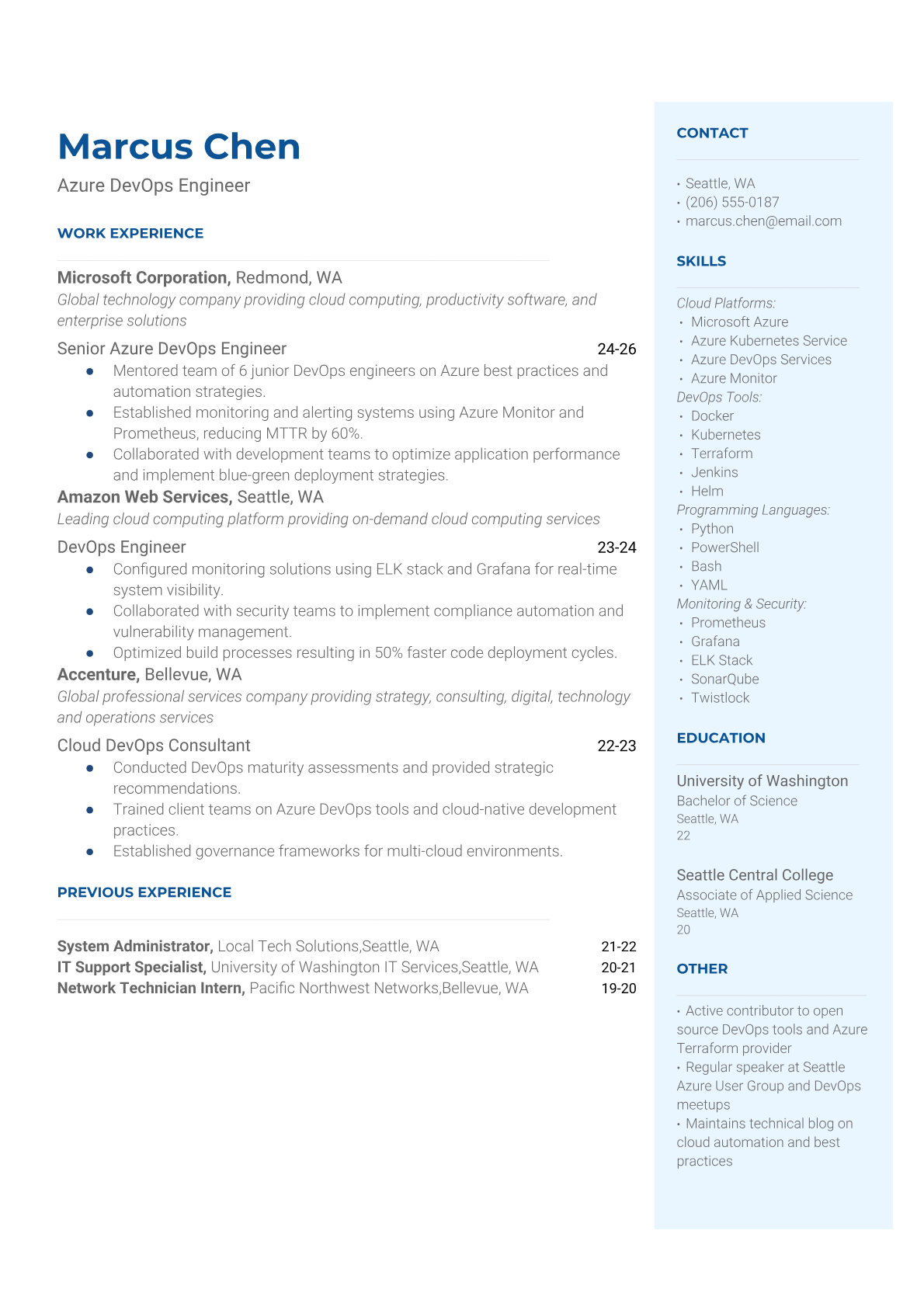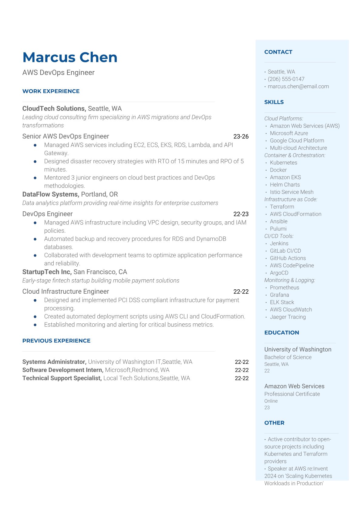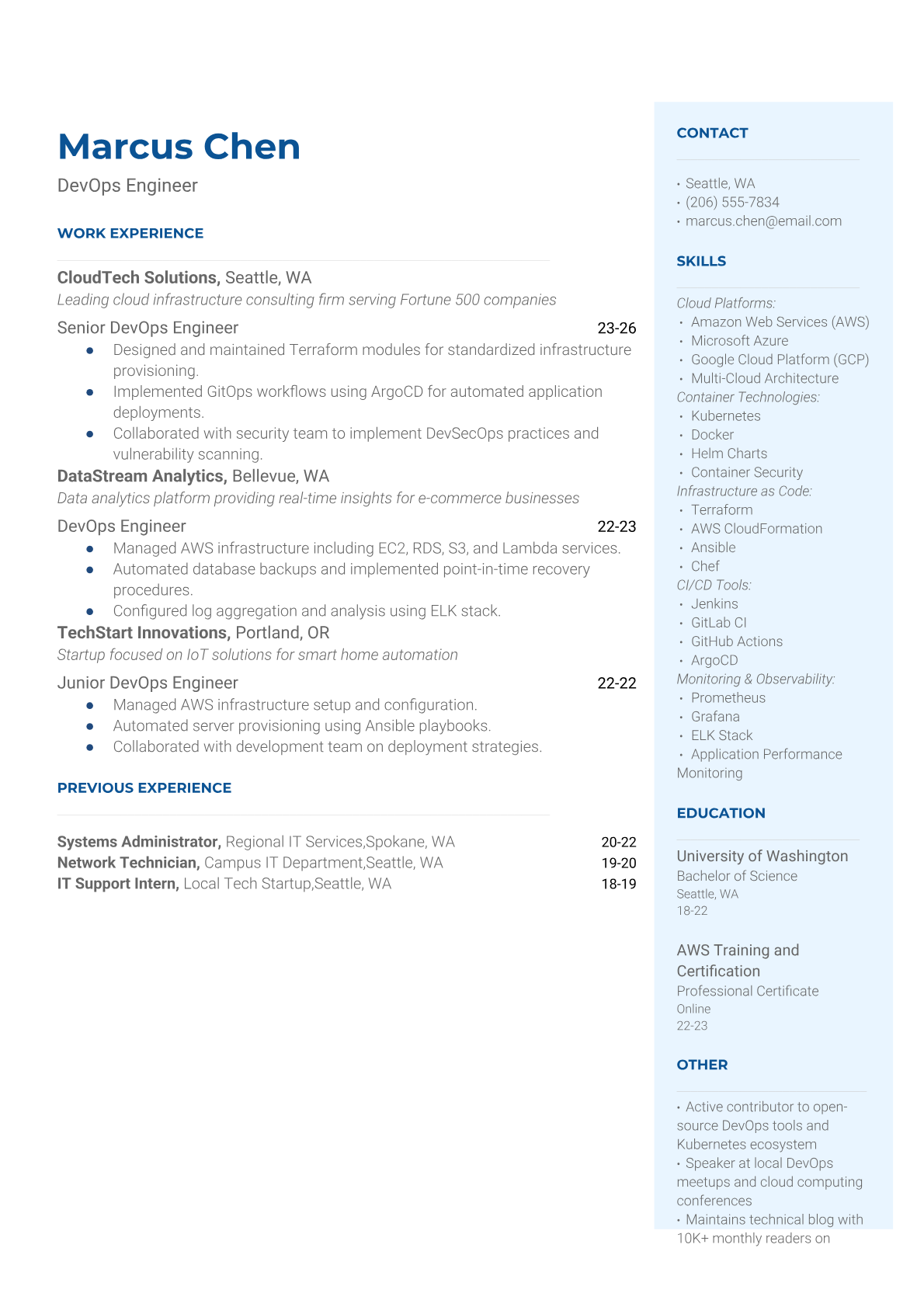 A DevOps Engineer bridges the gap between software development and IT operations, automating deployment pipelines, managing cloud infrastructure, and ensuring system reliability. They work with containerization tools like Docker and Kubernetes, CI/CD platforms, and cloud services to streamline software delivery and maintain scalable, secure systems. The role requires strong technical skills in scripting, infrastructure as code, and monitoring tools. An ATS-friendly resume is crucial for DevOps roles because tech companies heavily rely on automated screening to filter for specific tools, cloud platforms, and automation frameworks. Without proper keyword optimization for technologies like AWS, Jenkins, Terraform, and Python, qualified DevOps professionals often get filtered out before reaching hiring managers.