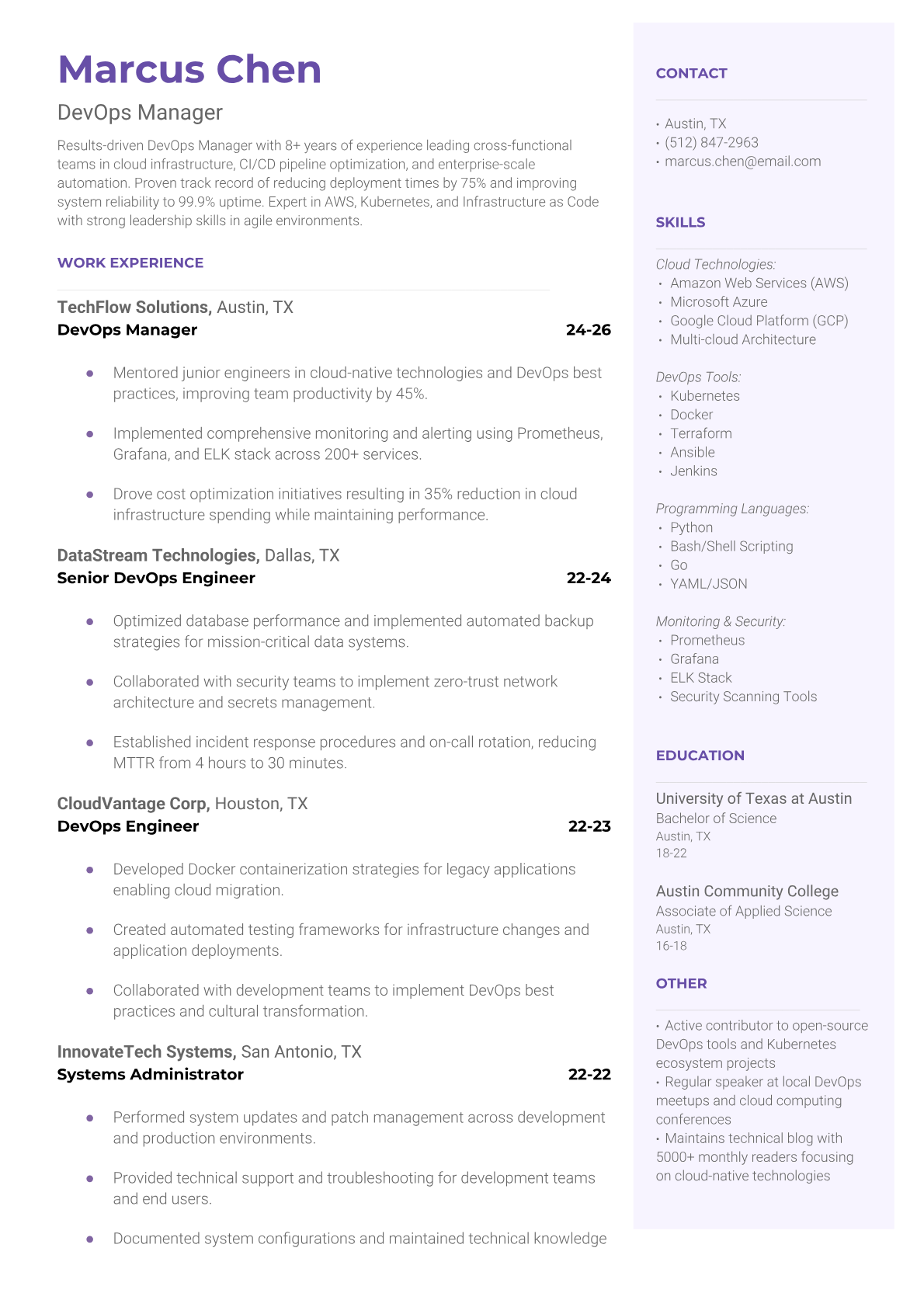 A DevOps Manager leads cross-functional teams to streamline software development and deployment processes through automation, infrastructure management, and continuous integration/continuous deployment (CI/CD) pipelines. They bridge the gap between development and operations teams while overseeing cloud infrastructure, monitoring systems, and ensuring scalable, reliable software delivery. The role combines deep technical expertise in tools like Docker, Kubernetes, AWS, and Jenkins with strong leadership and project management skills. An ATS-friendly resume is crucial for DevOps Manager positions because tech companies and enterprises use sophisticated screening systems that scan for specific technical keywords, certifications, and management experience. Without proper keyword optimization and clear formatting, qualified candidates with extensive DevOps and leadership experience may be filtered out before reaching hiring managers or technical recruiters.