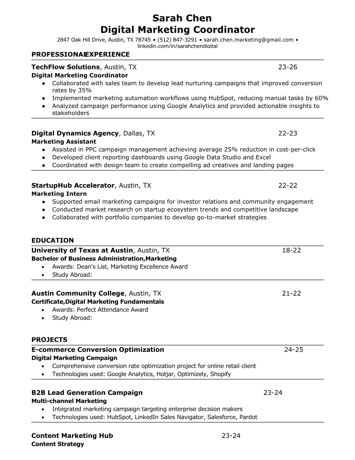 A Digital Marketing Coordinator manages and executes marketing campaigns across multiple digital channels including social media, email, content marketing, and paid advertising. They coordinate with creative teams, analyze campaign performance metrics, manage marketing automation tools, and ensure brand consistency across all digital touchpoints. The role requires both creative thinking and analytical skills to optimize marketing funnels and drive customer engagement. An ATS-friendly resume is crucial for Digital Marketing Coordinator positions because marketing departments heavily rely on automated screening to filter candidates based on specific platform experience, certifications, and technical skills. Without proper keyword optimization for tools like Google Analytics, HubSpot, or Facebook Ads Manager, qualified candidates often get filtered out before human recruiters can evaluate their creative potential and campaign results.