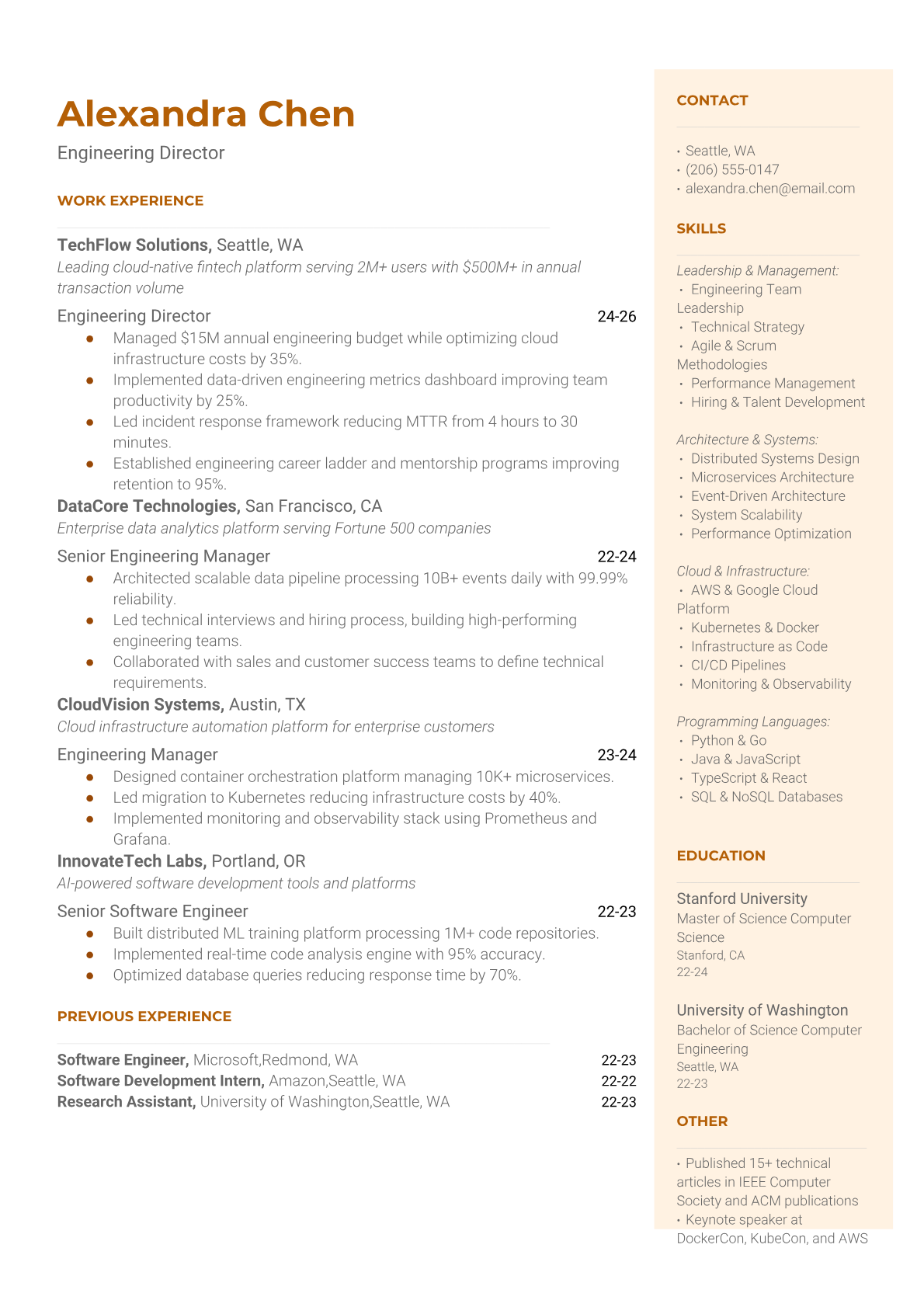 An Engineering Director leads technical teams and drives engineering strategy across multiple projects and departments. They balance hands-on technical expertise with executive leadership, overseeing architecture decisions, resource allocation, and cross-functional collaboration while ensuring delivery of complex software systems and products. ATS-friendly resumes are critical for Engineering Director roles because tech companies use sophisticated screening systems that filter for specific leadership keywords, technical stack experience, and quantifiable achievements. Without proper formatting and strategic keyword placement, even highly qualified engineering leaders may never reach human recruiters who can appreciate their full scope of technical and managerial expertise.