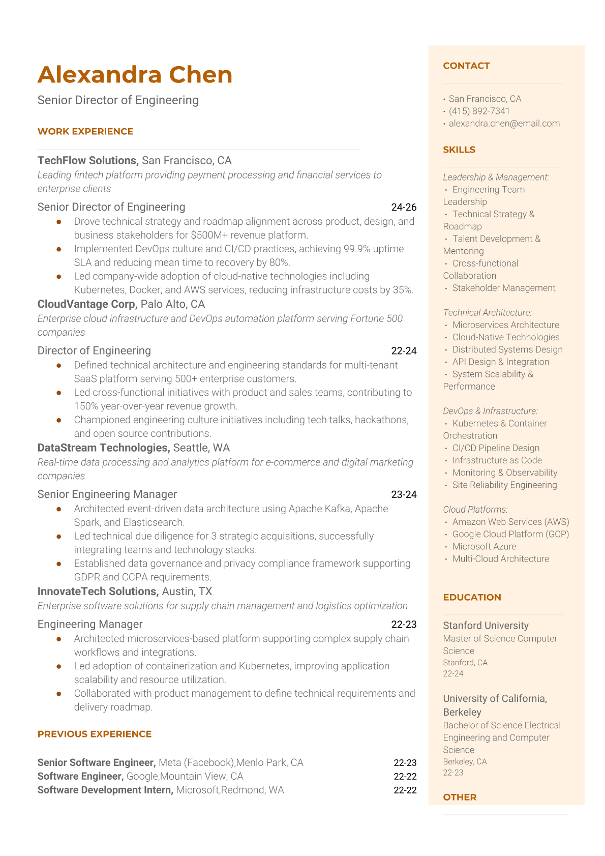 A Senior Director of Engineering leads large-scale engineering organizations, overseeing multiple teams and driving technical strategy across complex product portfolios. They balance hands-on technical leadership with executive responsibilities, managing budgets, hiring, and cross-functional partnerships while ensuring delivery of high-quality software solutions. This role requires deep technical expertise combined with strong business acumen and people management skills. An ATS-friendly resume is crucial for Senior Director positions because executive recruiters and Fortune 500 companies use sophisticated screening systems to filter for specific leadership competencies, technical frameworks, and scale indicators. Without proper keyword optimization and clear structure highlighting both technical depth and executive impact, even highly qualified candidates may not reach human reviewers.