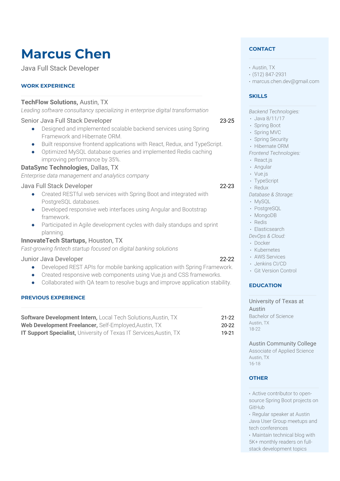 A Java Full Stack Developer builds end-to-end web applications using Java technologies for backend development and modern frameworks like React, Angular, or Vue.js for frontend interfaces. They work with databases, APIs, microservices, and cloud platforms to create scalable enterprise applications. The role requires expertise in both server-side and client-side technologies, along with knowledge of DevOps practices and agile development methodologies. An ATS-friendly resume is crucial because tech companies and recruiters use automated systems to screen for specific programming languages, frameworks, and technical certifications. Without proper keyword optimization and clear technical skill presentation, qualified Java developers often get filtered out before human review, especially at large corporations and tech firms.