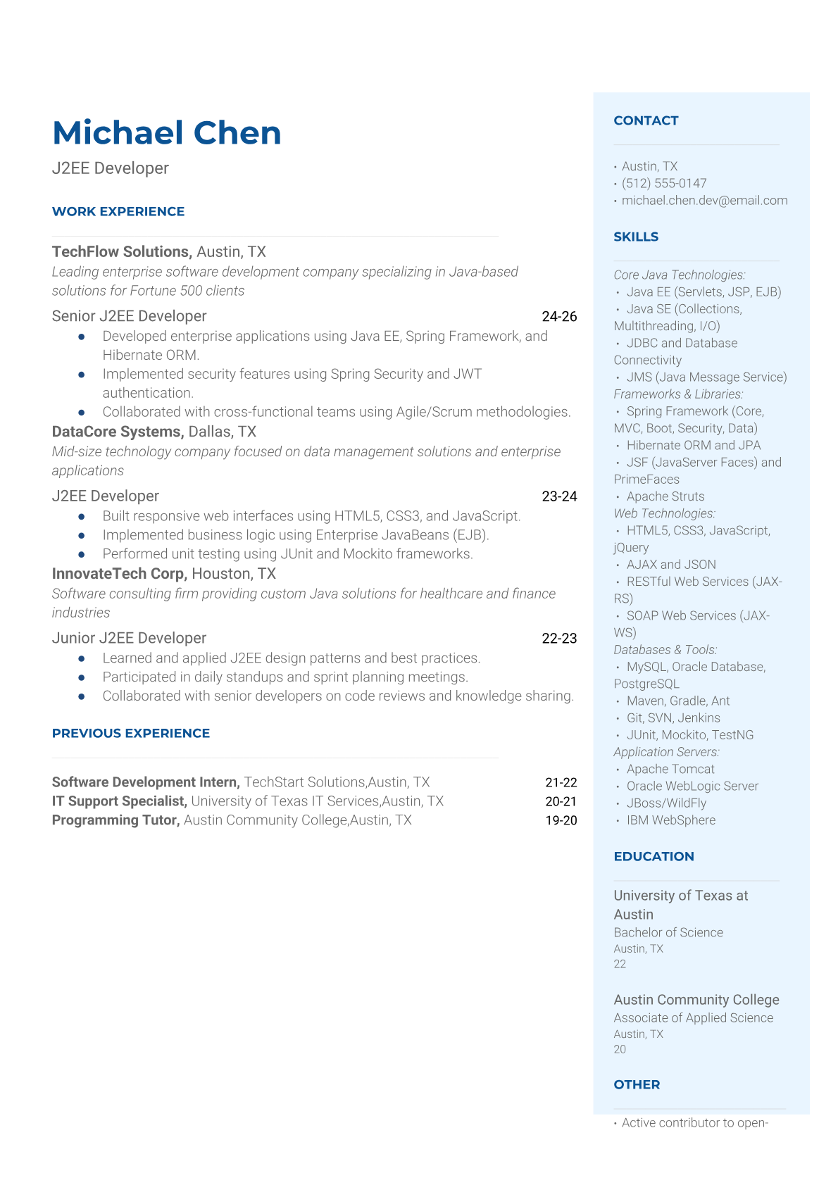 A J2EE Developer builds enterprise-level web applications using Java Enterprise Edition technologies including servlets, JSP, EJB, and frameworks like Spring and Struts. They work on scalable, distributed systems for large organizations, handling complex business logic, database integration, and web services development. The role requires deep knowledge of Java programming, application servers, and enterprise architecture patterns. An ATS-friendly resume is crucial for J2EE Developer positions because tech recruiters and hiring managers use automated systems to screen for specific Java frameworks, application servers, and enterprise technologies. Without proper keyword optimization and clear technical skill presentation, qualified developers often get filtered out before human review.