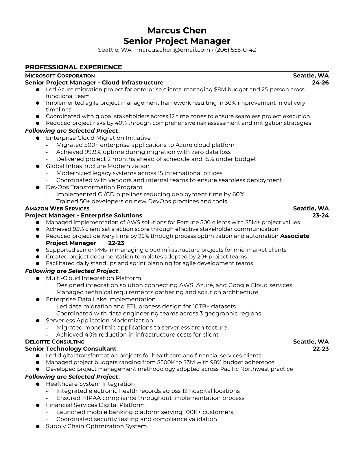 A Senior Project Manager leads complex initiatives from conception to completion, coordinating cross-functional teams, managing budgets, and ensuring deliverables meet quality standards and deadlines. They serve as the primary liaison between stakeholders, clients, and technical teams while mitigating risks and resolving conflicts that arise during project execution. ATS-friendly resumes are crucial for Senior Project Manager roles because most organizations use automated screening to filter for specific methodologies (Agile, Scrum, Waterfall), certifications (PMP, PRINCE2), and industry experience. Without proper keyword optimization and clear formatting, even highly qualified project managers may be filtered out before human recruiters can assess their leadership capabilities and project success metrics.