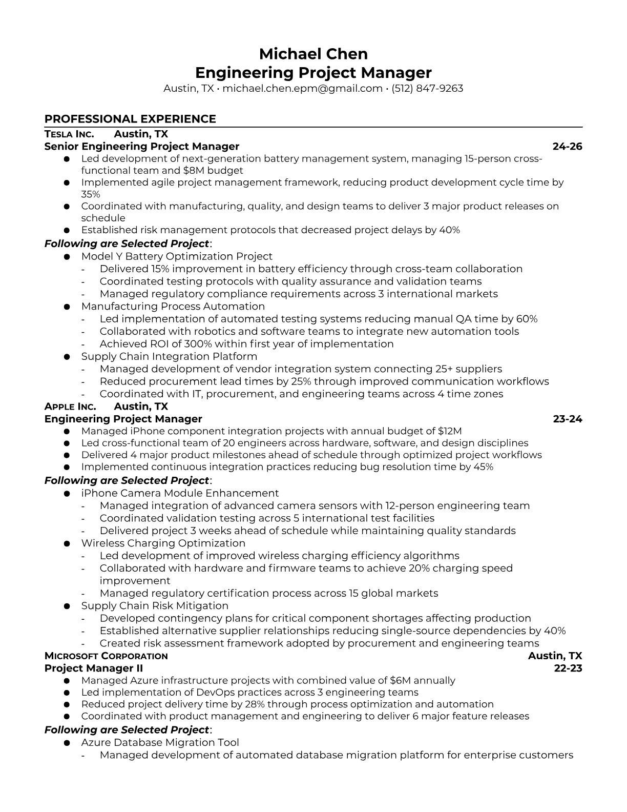 An Engineering Project Manager leads cross-functional teams to deliver complex technical projects on time and within budget. They bridge the gap between engineering teams and business stakeholders, managing project scope, timelines, resources, and risk mitigation while ensuring technical deliverables meet quality standards. The role requires both technical engineering background and strong project management skills including proficiency with methodologies like Agile, Scrum, and traditional waterfall approaches. ATS-friendly resumes are crucial for Engineering Project Manager roles because most tech companies and engineering firms use automated screening to filter for specific project management certifications (PMP, Scrum Master), technical skills, and industry experience. Without proper keyword optimization and clear formatting, qualified candidates with proven track records of successful project delivery can be filtered out before human recruiters review their applications.