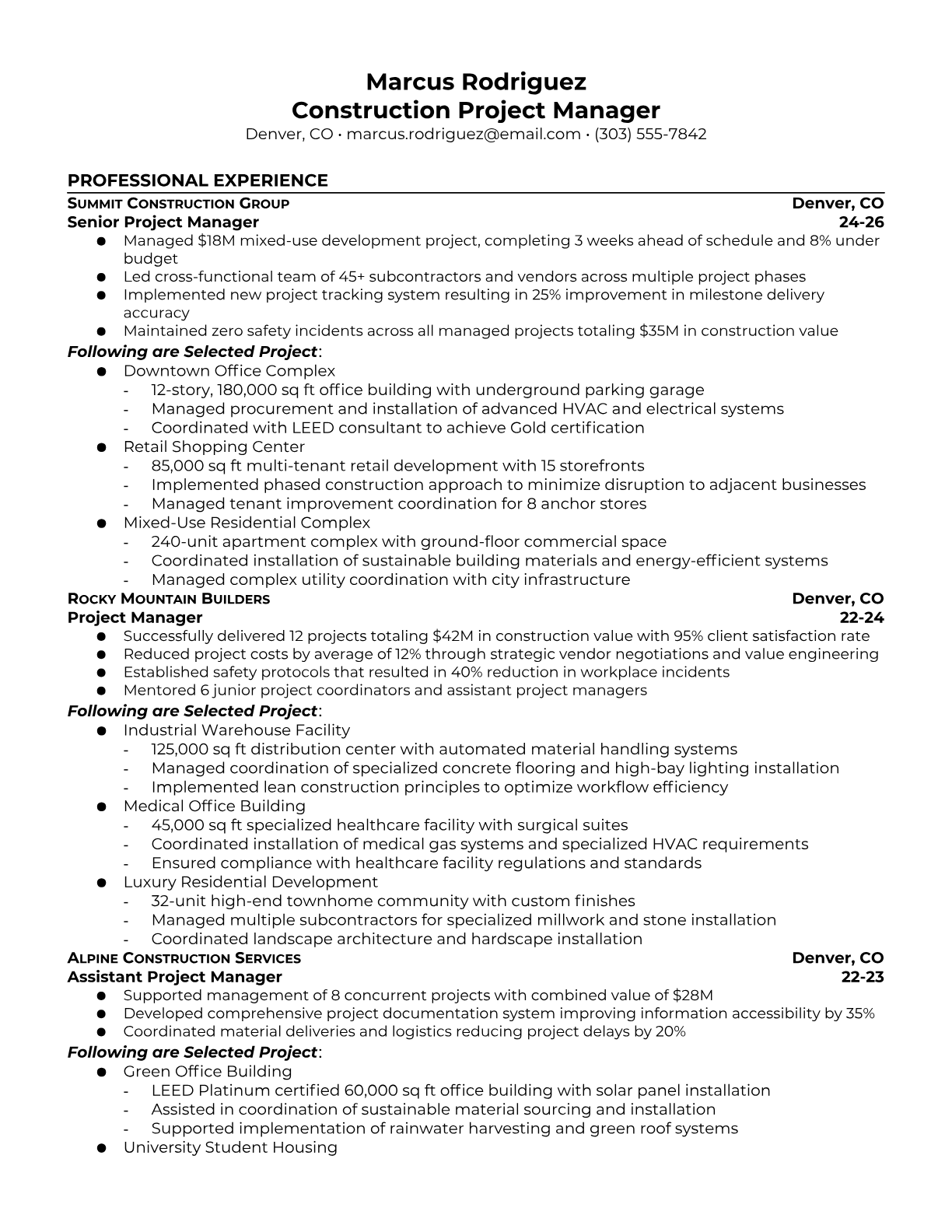 A Construction Project Manager oversees building projects from initial planning through completion, coordinating with architects, contractors, suppliers, and regulatory agencies. They manage budgets, schedules, safety compliance, and quality control while ensuring projects meet specifications and deadlines. The role requires strong leadership skills, technical construction knowledge, and expertise in project management methodologies. ATS-friendly resumes are crucial in construction management because most general contractors, developers, and construction firms use automated screening to filter for specific certifications (PMP, OSHA), software proficiency (Procore, Primavera), and project experience. Without proper keyword optimization and clear formatting, qualified project managers may be overlooked before human recruiters review their applications.