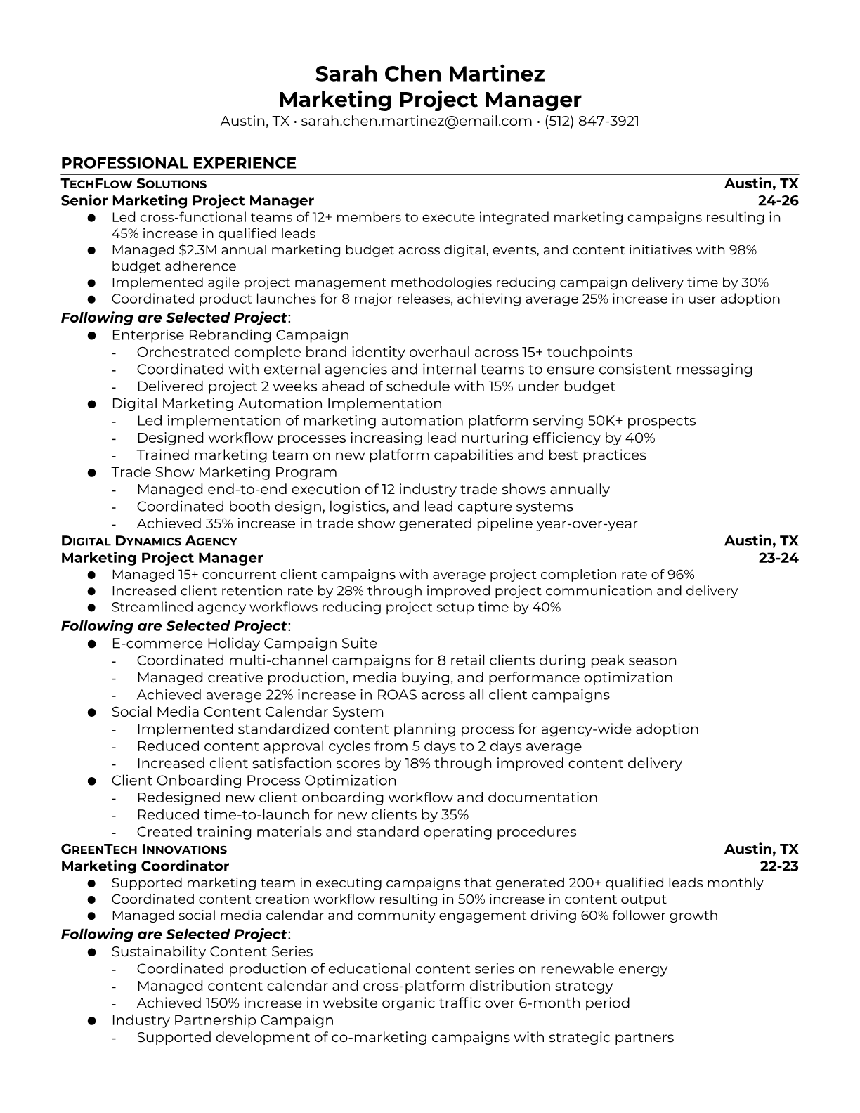 A Marketing Project Manager orchestrates cross-functional marketing campaigns from conception to completion, coordinating with creative teams, digital specialists, and stakeholders to deliver projects on time and within budget. They manage campaign timelines, resource allocation, and performance metrics while ensuring brand consistency across all marketing channels and touchpoints. ATS-friendly resumes are crucial for Marketing Project Manager roles because marketing departments rely heavily on applicant tracking systems to screen for specific project management methodologies, marketing automation tools, and campaign management experience. Without proper keyword optimization and clear formatting, qualified candidates with strong campaign leadership experience may be filtered out before recruiters can assess their strategic marketing capabilities.