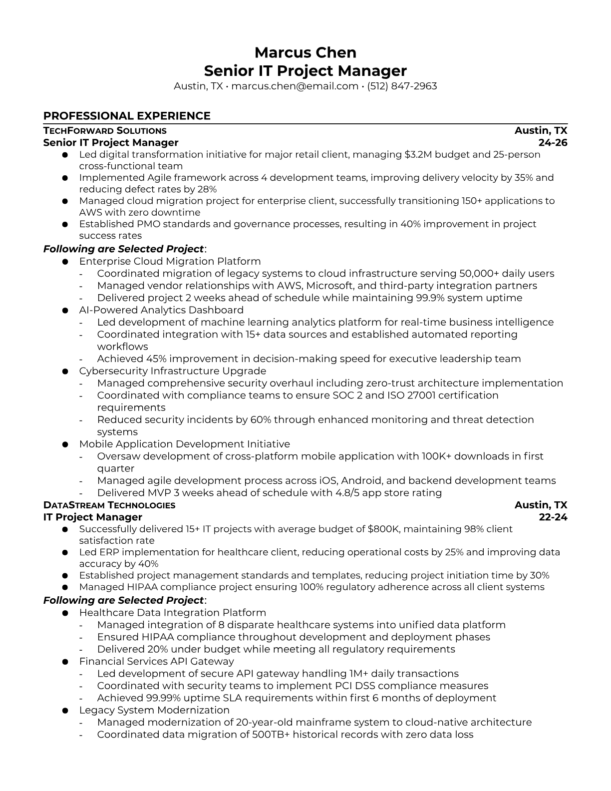 An IT Project Manager leads technology initiatives from conception to delivery, coordinating cross-functional teams, managing budgets, and ensuring projects meet technical requirements and business objectives. They work with stakeholders, developers, and vendors to implement software solutions, infrastructure upgrades, and digital transformation initiatives while managing scope, timeline, and resource constraints. An ATS-friendly resume is crucial for IT Project Manager roles because technology companies and enterprises use sophisticated screening systems that filter for specific project management methodologies, technical certifications, and industry keywords. Without proper formatting and relevant terms like Agile, Scrum, PMP, or ITIL, qualified candidates may be automatically rejected before human recruiters review their leadership experience and technical accomplishments.