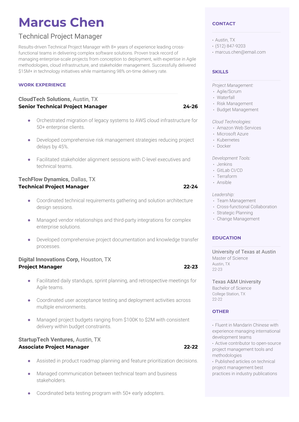 A Technical Project Manager bridges the gap between engineering teams and business stakeholders, overseeing software development projects from conception to delivery. They coordinate cross-functional teams, manage project timelines and budgets, and ensure technical solutions align with business objectives while maintaining quality standards and risk mitigation. An ATS-friendly resume is crucial for Technical Project Manager roles because companies use automated systems to screen for specific project management methodologies, technical tools, and leadership experience. Without proper keyword optimization for terms like Agile, Scrum, JIRA, and stakeholder management, qualified candidates may be filtered out before human recruiters can evaluate their project leadership capabilities.