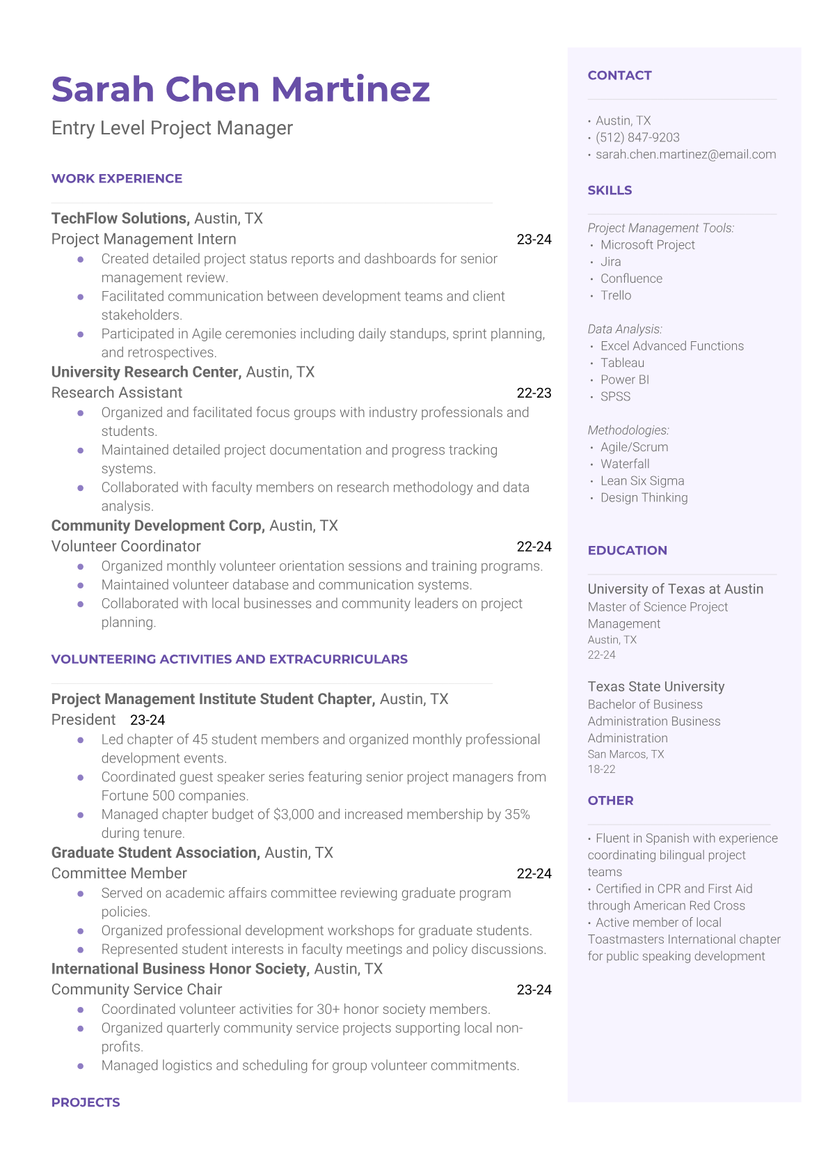 An Entry Level Project Manager coordinates project activities, timelines, and resources while learning fundamental project management methodologies like Agile and Waterfall. They support senior project managers in planning, executing, and monitoring projects across various industries, gaining hands-on experience with project management tools like Microsoft Project, Jira, and Trello. The role typically requires strong organizational skills, basic understanding of project lifecycles, and often benefits from certifications like CAPM or Google Project Management Certificate. An ATS-friendly resume is crucial for entry-level project management positions because companies use automated systems to screen for specific project management keywords, methodologies, and tools. Without proper formatting and relevant terminology like 'stakeholder management,' 'risk assessment,' and 'project deliverables,' qualified candidates may be filtered out before human recruiters review their applications.