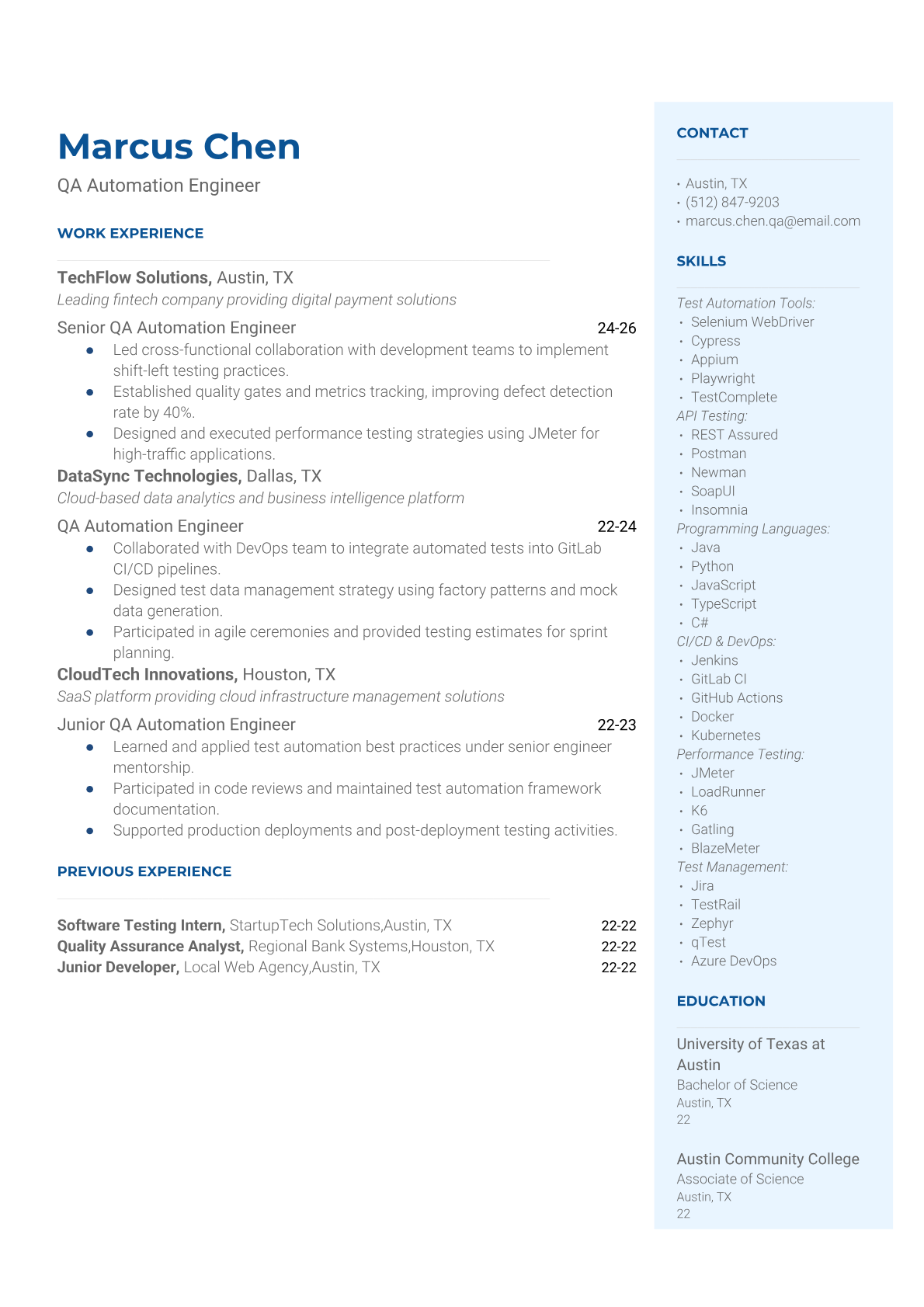 A QA Automation Engineer designs, develops, and maintains automated testing frameworks to ensure software quality and reliability. They create test scripts using tools like Selenium, Cypress, or TestNG, integrate tests into CI/CD pipelines, and collaborate with development teams to identify and resolve defects early in the software development lifecycle. An ATS-friendly resume is crucial for QA Automation Engineers because tech companies heavily rely on automated screening to filter candidates based on specific testing tools, programming languages, and automation frameworks. Without proper keyword optimization and clear technical skill presentation, qualified automation engineers often get filtered out before reaching hiring managers.