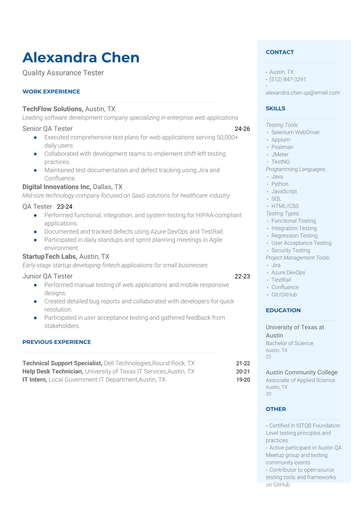 Proven Quality Assurance resume templates and examples. Expert guidance to highlight your testing and quality control expertise.